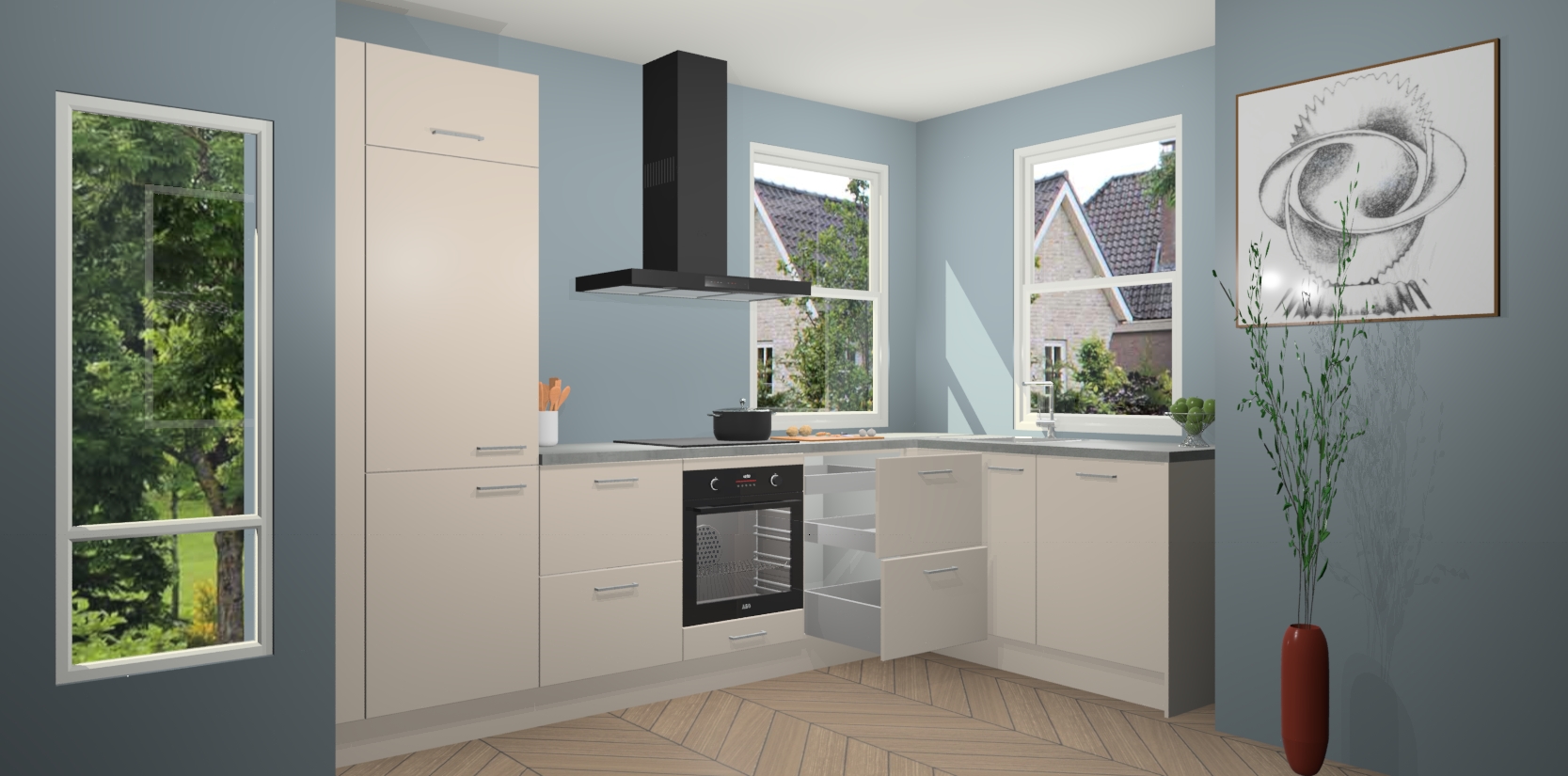In deze box zijn alle kleuren verzameld van de deuren en werkbladen. Vraag de gratis kleurenbox aan en kijk thuis rustig verder!