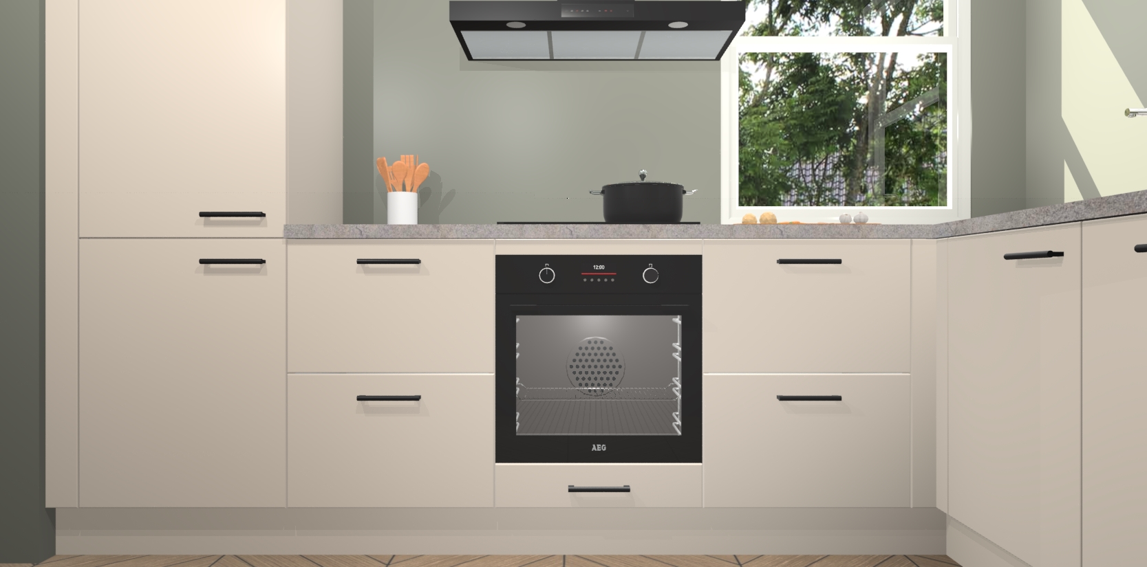 Wat maakt deze keuken zo bijzonder? Ten eerste geeft het houten werkblad uw ruimte een onmiskenbaar klassieke uitstraling. De natuurlijke afwerking roept warmte en elegantie op die nooit uit de mode zullen raken. Bovendien is het gemakkelijk schoon te houden en te onderhouden, zodat je er jarenlang plezier van kunt hebben. Als u op zoek bent naar extra gemak in uw keuken, dan heeft u bij het plaatsen van een bestelling bij ons ook de optie om uw toestellen te upgraden naar AEG-modellen - zo haalt u moderne innovatie van topmerken in apparatentechnologie rechtstreeks in huis.