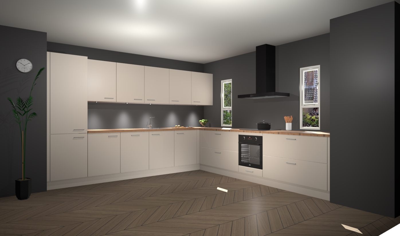 De kasjmier keuken is een ideale hoekkeuken en heeft alle functies en apparatuur die u maar nodig kunt hebben. Bij de bestelling krijgt u een oven, inductiekookplaat, afzuigkap, vaatwasser en koelkast - deze kunnen desgewenst eenvoudig worden uitgebreid naar AEG na bestellen. Elke kast wordt ook voor gemonteerd geleverd met soft close deuren die jarenlang gebruik beloven. Stelt u zich voor dat u geen gedoe heeft met vervelende montage - vanaf het moment dat u uw bestelling plaats, duurt het slechts 7 weken voor het bij u thuis geleverd wordt.