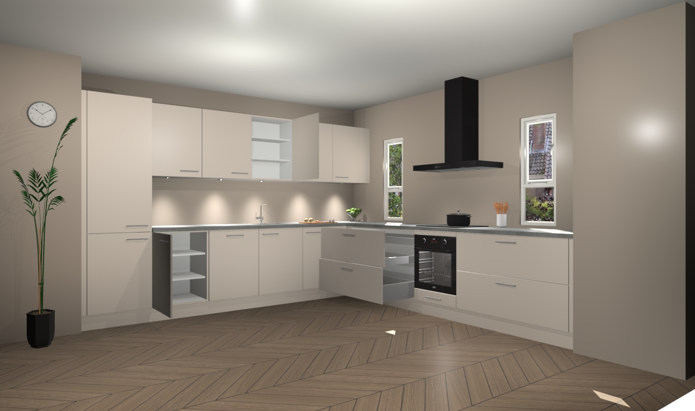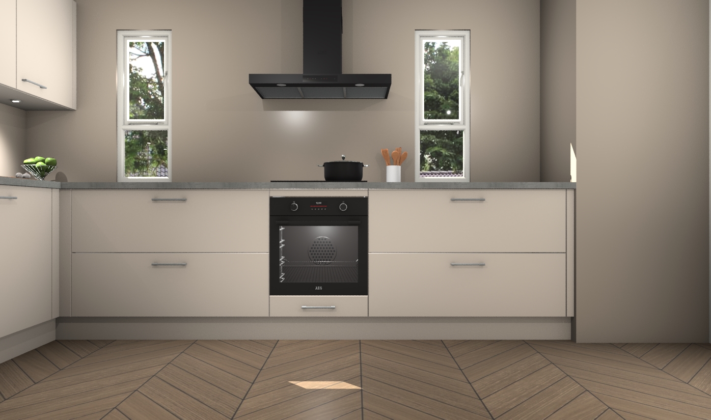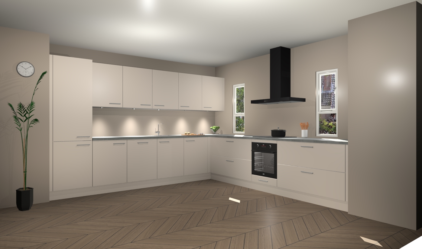 De kasjmier keuken is een ideale hoekkeuken en heeft alle functies en apparatuur die u maar nodig kunt hebben. Bij de bestelling krijgt u een oven, inductiekookplaat, afzuigkap, vaatwasser en koelkast - deze kunnen desgewenst eenvoudig worden uitgebreid naar AEG na bestellen. Elke kast wordt ook voor gemonteerd geleverd met soft close deuren die jarenlang gebruik beloven. Stelt u zich voor dat u geen gedoe heeft met vervelende montage - vanaf het moment dat u uw bestelling plaats, duurt het slechts 7 weken voor het bij u thuis geleverd wordt.