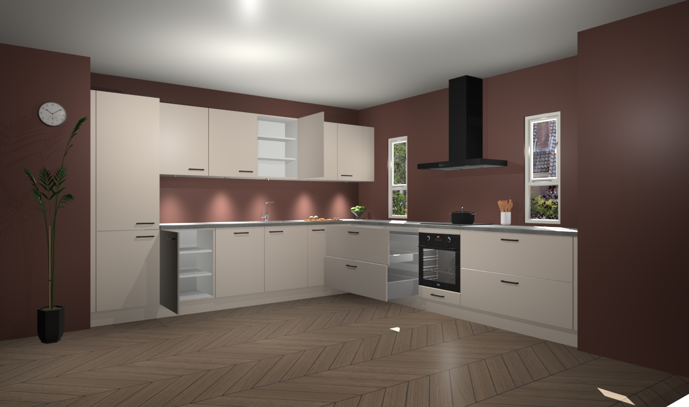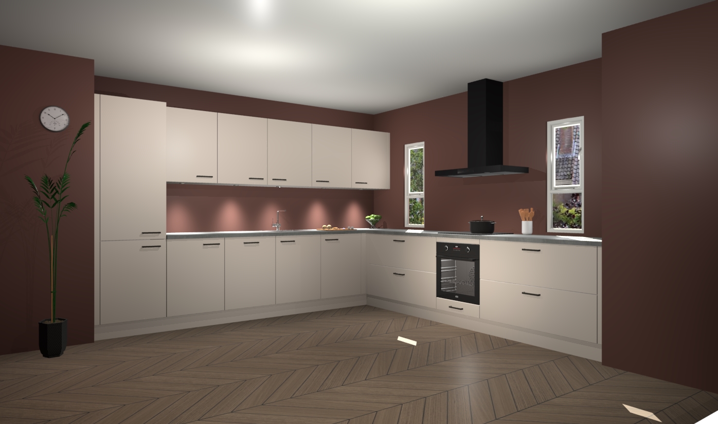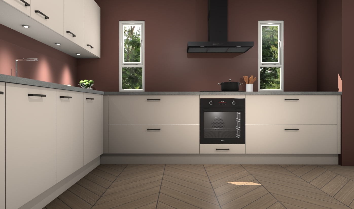 De kasjmier keuken is een ideale hoekkeuken en heeft alle functies en apparatuur die u maar nodig kunt hebben. Bij de bestelling krijgt u een oven, inductiekookplaat, afzuigkap, vaatwasser en koelkast - deze kunnen desgewenst eenvoudig worden uitgebreid naar AEG na bestellen. Elke kast wordt ook voor gemonteerd geleverd met soft close deuren die jarenlang gebruik beloven. Stelt u zich voor dat u geen gedoe heeft met vervelende montage - vanaf het moment dat u uw bestelling plaats, duurt het slechts 7 weken voor het bij u thuis geleverd wordt.