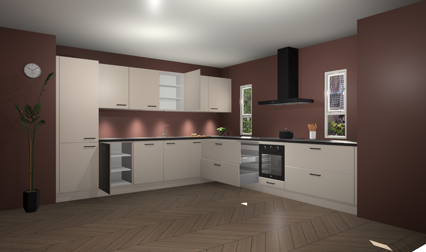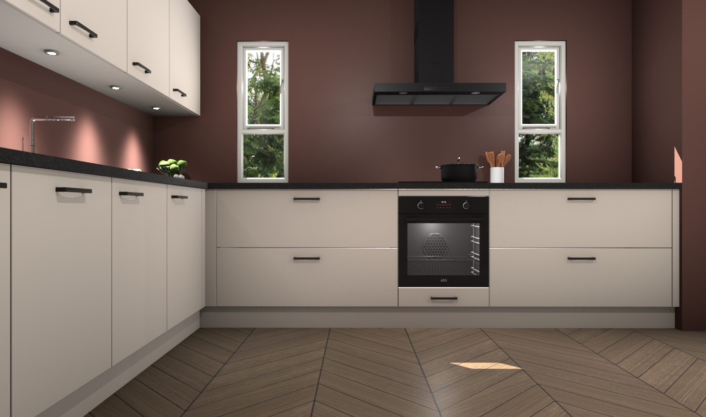 De kasjmier keuken is een ideale hoekkeuken en heeft alle functies en apparatuur die u maar nodig kunt hebben. Bij de bestelling krijgt u een oven, inductiekookplaat, afzuigkap, vaatwasser en koelkast - deze kunnen desgewenst eenvoudig worden uitgebreid naar AEG na bestellen. Elke kast wordt ook voor gemonteerd geleverd met soft close deuren die jarenlang gebruik beloven. Stelt u zich voor dat u geen gedoe heeft met vervelende montage - vanaf het moment dat u uw bestelling plaats, duurt het slechts 7 weken voor het bij u thuis geleverd wordt.