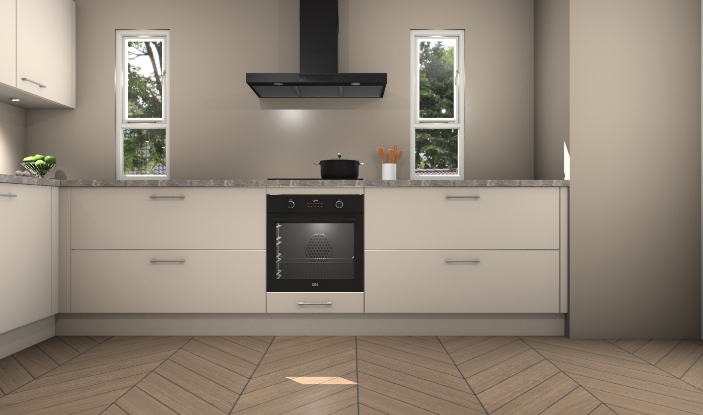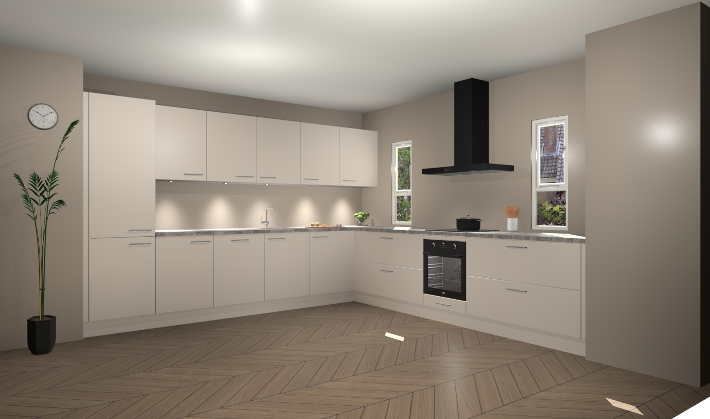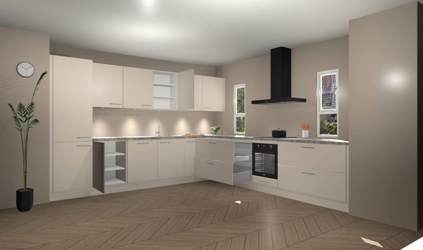 De kasjmier keuken is een ideale hoekkeuken en heeft alle functies en apparatuur die u maar nodig kunt hebben. Bij de bestelling krijgt u een oven, inductiekookplaat, afzuigkap, vaatwasser en koelkast - deze kunnen desgewenst eenvoudig worden uitgebreid naar AEG na bestellen. Elke kast wordt ook voor gemonteerd geleverd met soft close deuren die jarenlang gebruik beloven. Stelt u zich voor dat u geen gedoe heeft met vervelende montage - vanaf het moment dat u uw bestelling plaats, duurt het slechts 7 weken voor het bij u thuis geleverd wordt.