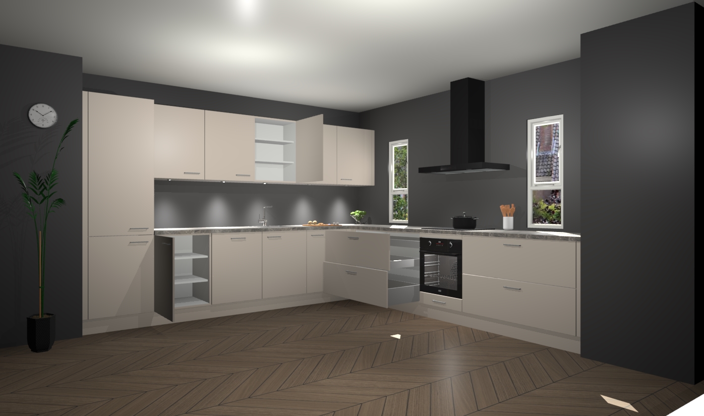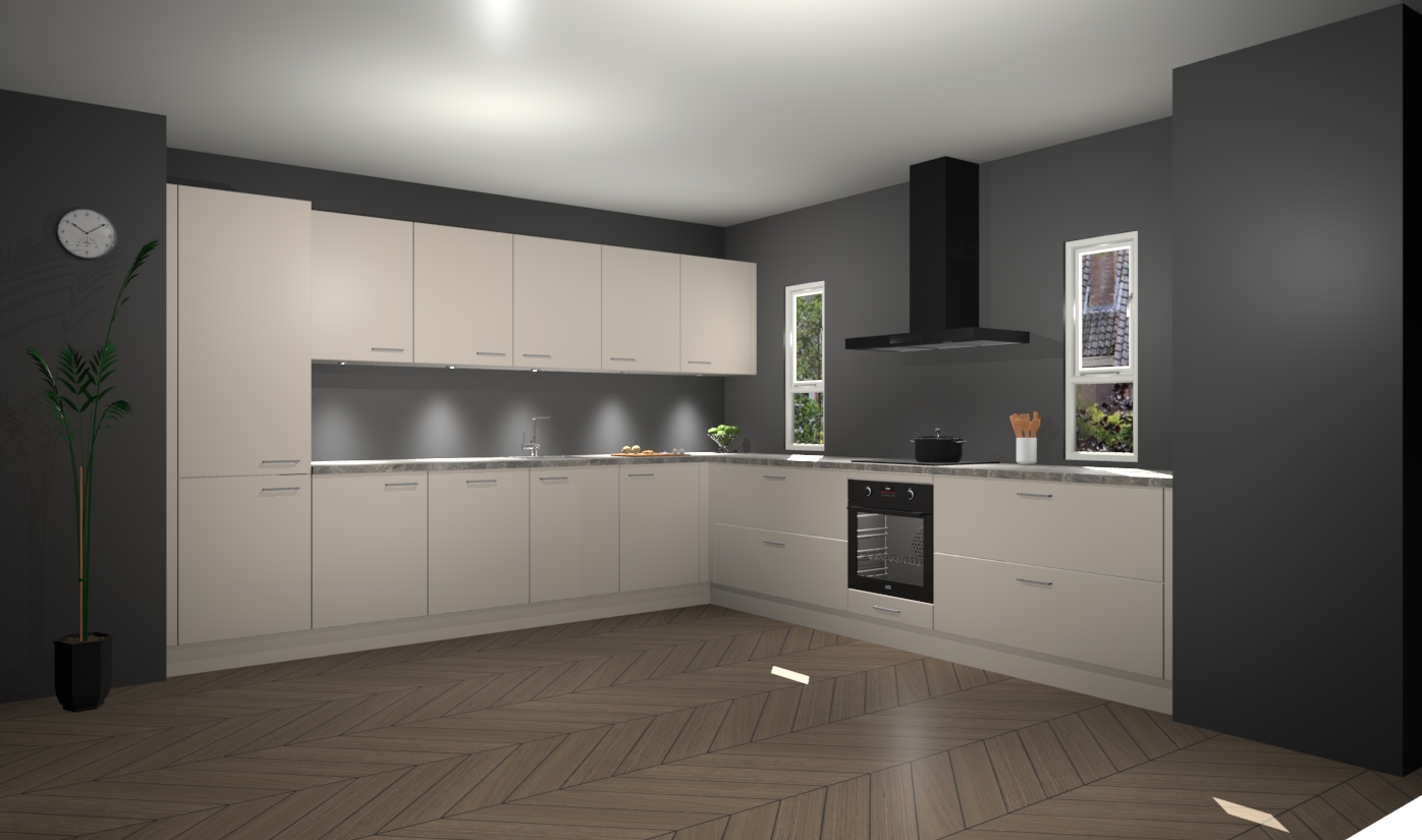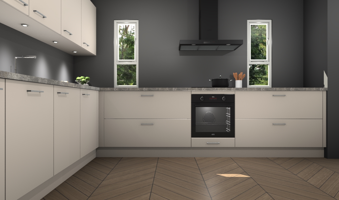 De kasjmier keuken is een ideale hoekkeuken en heeft alle functies en apparatuur die u maar nodig kunt hebben. Bij de bestelling krijgt u een oven, inductiekookplaat, afzuigkap, vaatwasser en koelkast - deze kunnen desgewenst eenvoudig worden uitgebreid naar AEG na bestellen. Elke kast wordt ook voor gemonteerd geleverd met soft close deuren die jarenlang gebruik beloven. Stelt u zich voor dat u geen gedoe heeft met vervelende montage - vanaf het moment dat u uw bestelling plaats, duurt het slechts 7 weken voor het bij u thuis geleverd wordt.