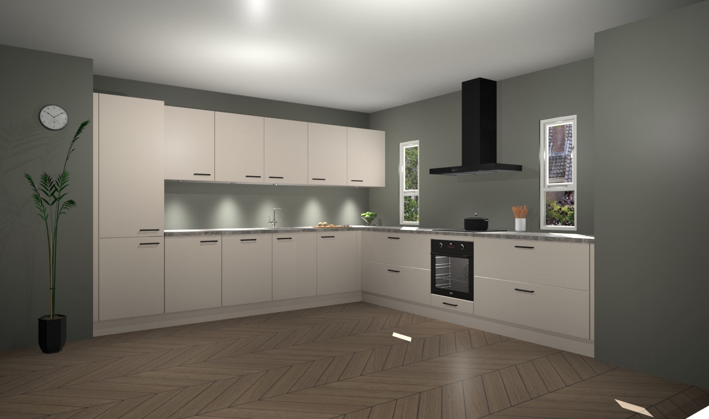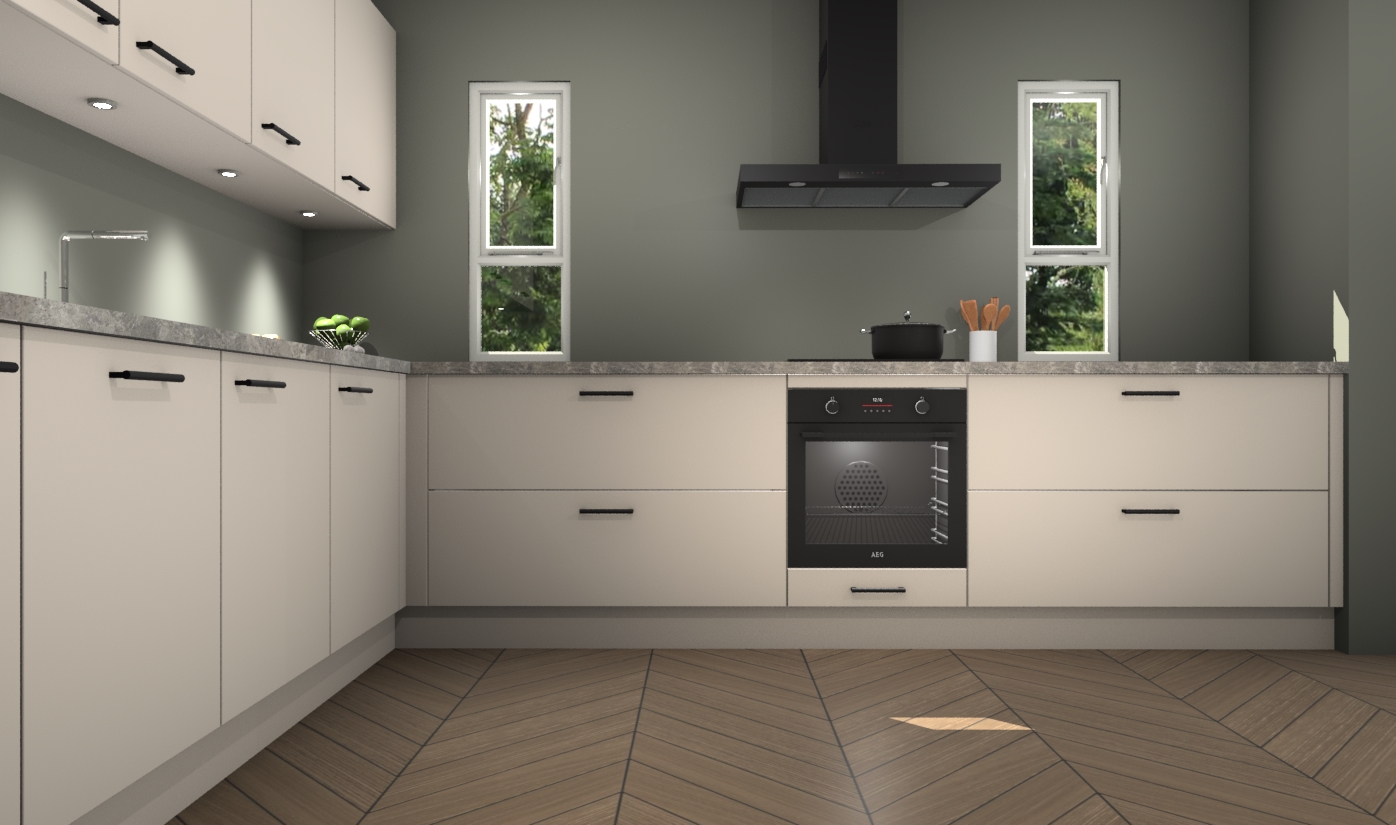 De kasjmier keuken is een ideale hoekkeuken en heeft alle functies en apparatuur die u maar nodig kunt hebben. Bij de bestelling krijgt u een oven, inductiekookplaat, afzuigkap, vaatwasser en koelkast - deze kunnen desgewenst eenvoudig worden uitgebreid naar AEG na bestellen. Elke kast wordt ook voor gemonteerd geleverd met soft close deuren die jarenlang gebruik beloven. Stelt u zich voor dat u geen gedoe heeft met vervelende montage - vanaf het moment dat u uw bestelling plaats, duurt het slechts 7 weken voor het bij u thuis geleverd wordt.