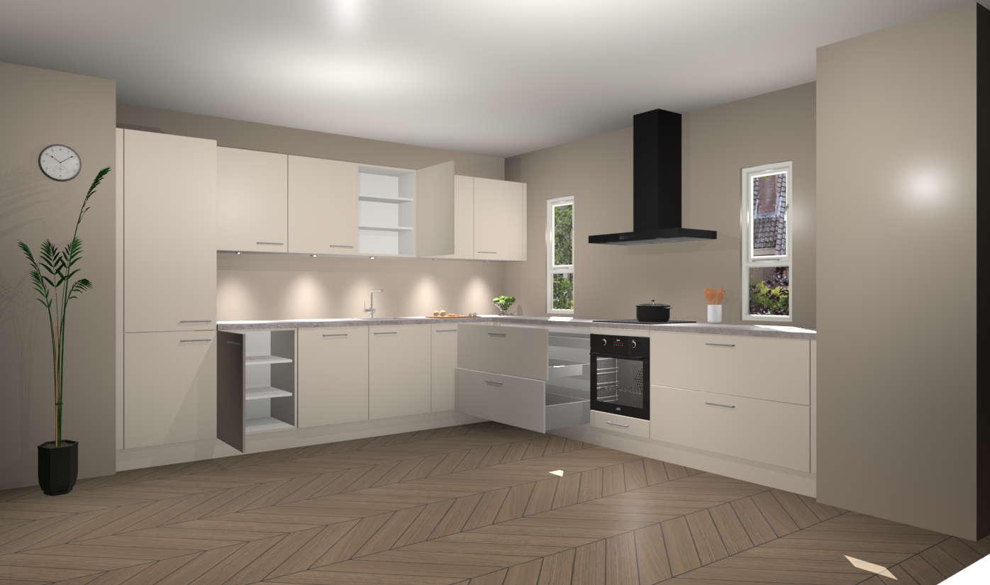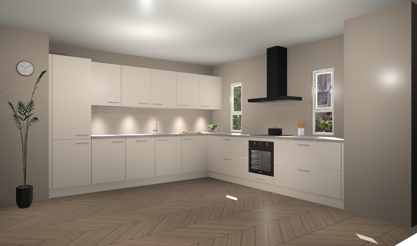 De kasjmier keuken is een ideale hoekkeuken en heeft alle functies en apparatuur die u maar nodig kunt hebben. Bij de bestelling krijgt u een oven, inductiekookplaat, afzuigkap, vaatwasser en koelkast - deze kunnen desgewenst eenvoudig worden uitgebreid naar AEG na bestellen. Elke kast wordt ook voor gemonteerd geleverd met soft close deuren die jarenlang gebruik beloven. Stelt u zich voor dat u geen gedoe heeft met vervelende montage - vanaf het moment dat u uw bestelling plaats, duurt het slechts 7 weken voor het bij u thuis geleverd wordt.