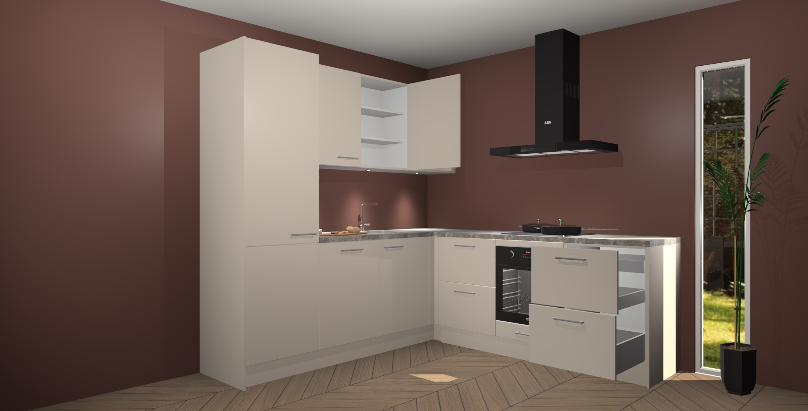 Met zijn moderne design en aantrekkelijke hoekopstelling biedt deze keuken een unieke look die zelfs de meest veeleisende huiseigenaar zal bevallen. En omdat de binnenkant van de kasten dezelfde kleur heeft als de buitenkant, heeft uw keuken een consistente afwerking. Bovenop de geweldige look is opbergruimte ook geen probleem, met voldoende kast- en laderuimte achter zelfs de mooiste buitenkant.
