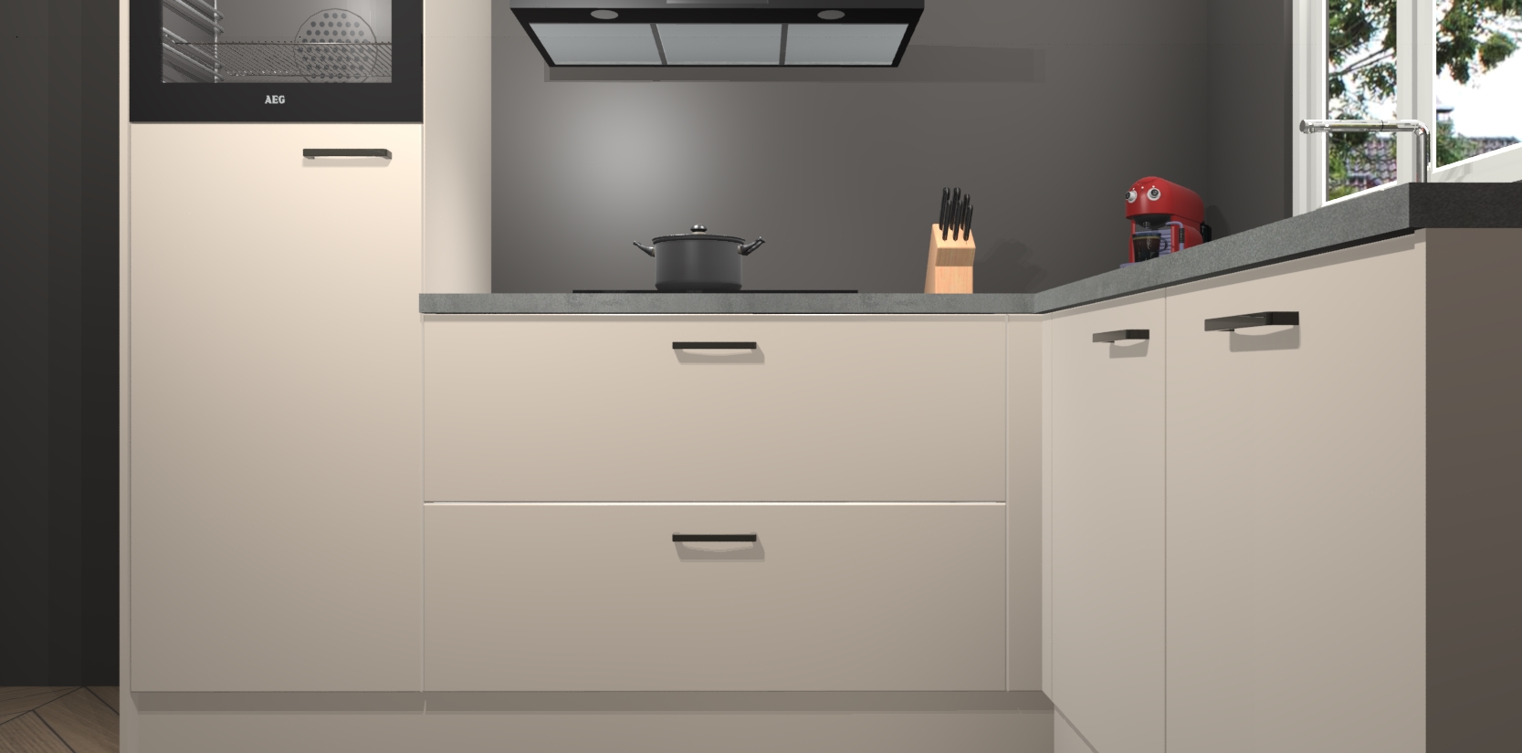 Dit model biedt u voldoende opbergruimte en vijf ingebouwde apparaten: een oven, inductiekookplaat, afzuigkap, vaatwasser en koelkast. Deze apparaten kunnen gemakkelijk worden geüpgrade naar AEG nadat u besteld heeft. De verschillende laden en kastjes bevatten softclose-deuren waardoor ze gezellig dichtvallen met een geruststellend helemaal geruisloos geluid. En dat is nog niet alles! We garanderen ook dat de prijs altijd laag blijft - dus haal nu uw Kasjmier keuken Victoria terwijl het kan.