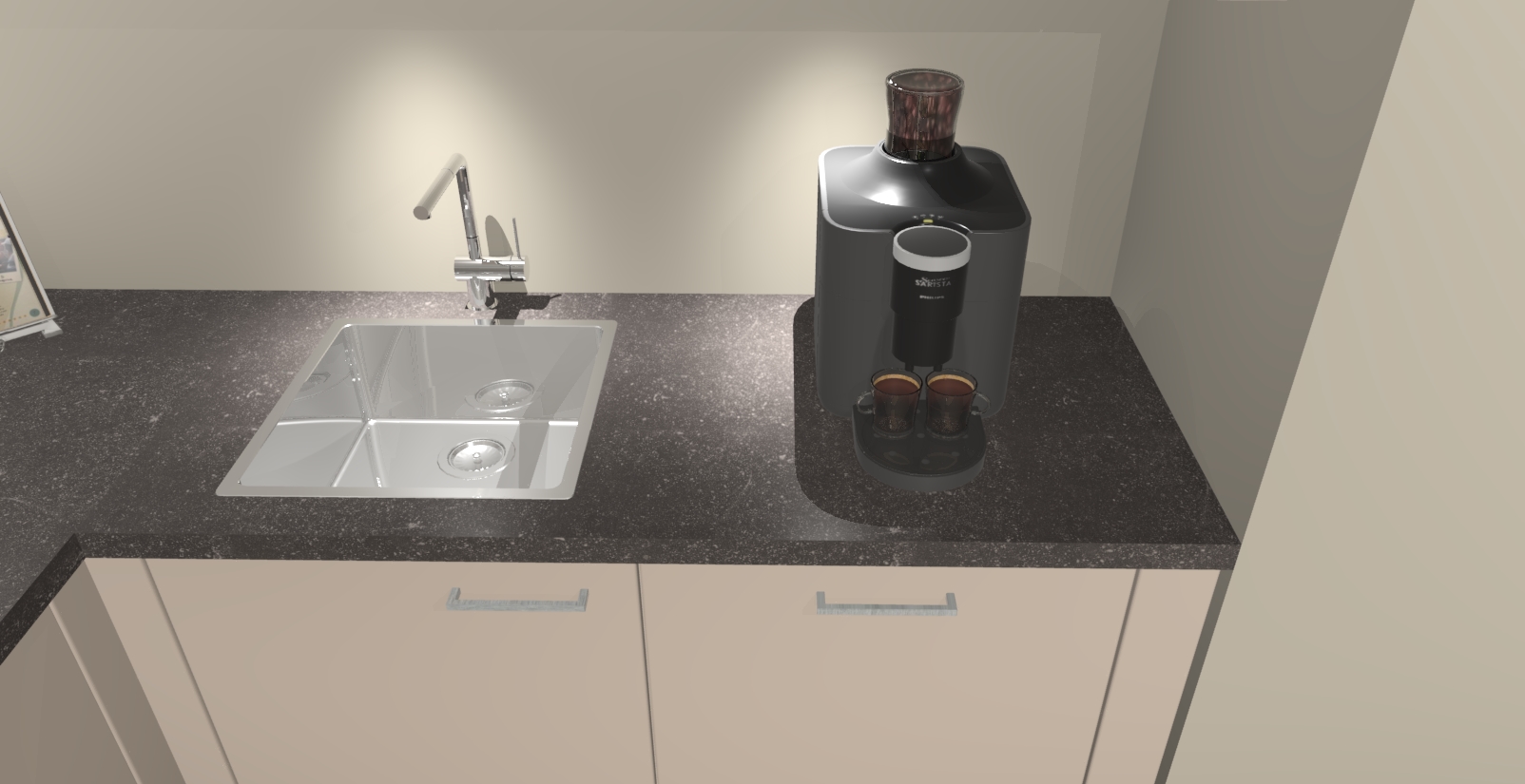 - De spoelbak is nog niet in gevreesd. Dit dient tijdens het werk gedaan te worden