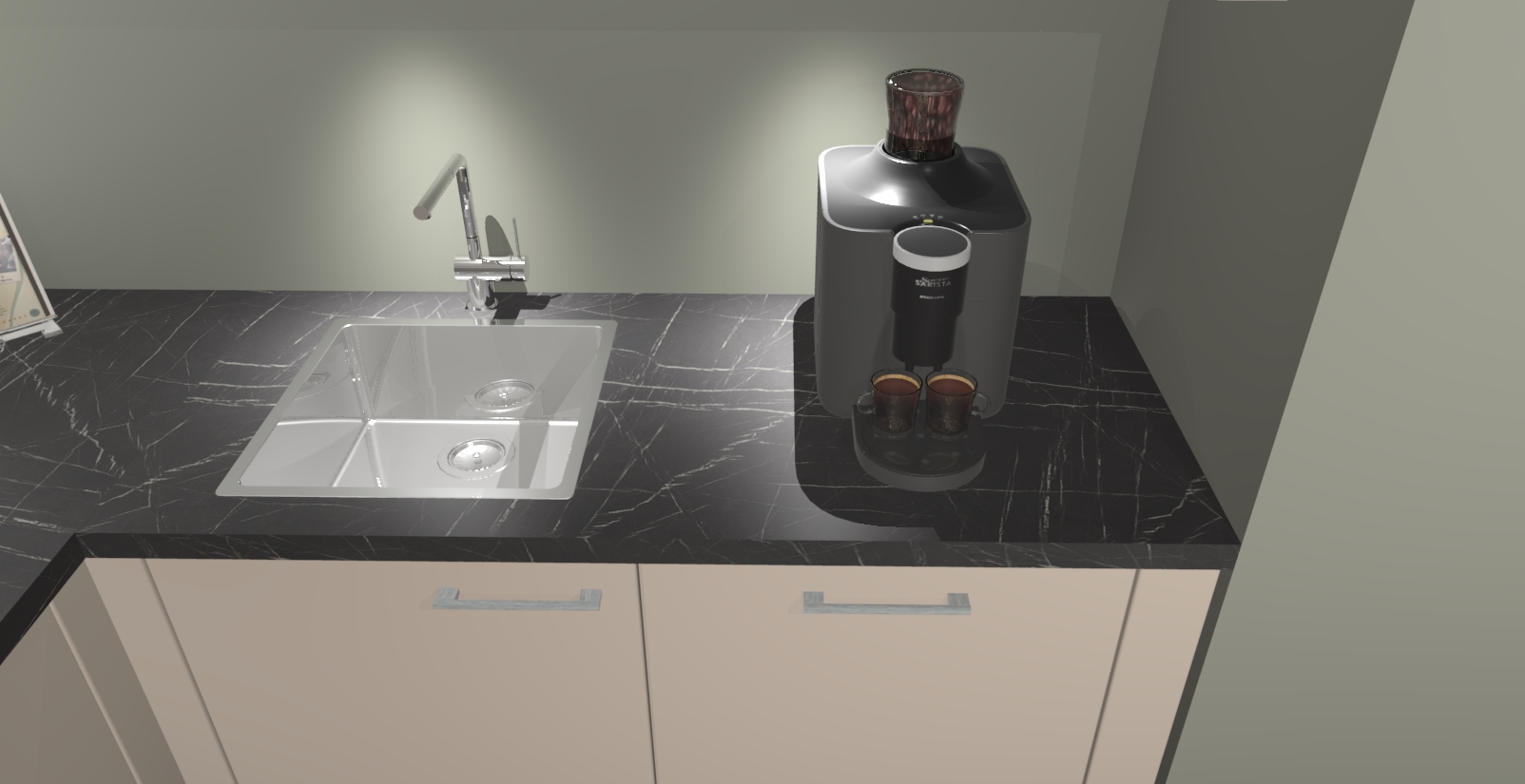 - De spoelbak is nog niet in gevreesd. Dit dient tijdens het werk gedaan te worden