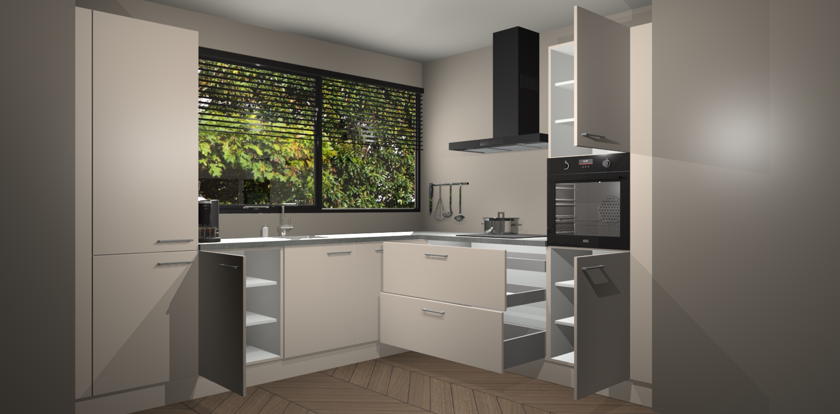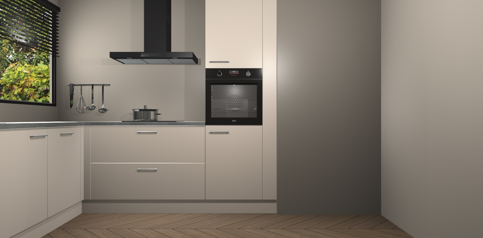 Met een modern, tijdloos design en ruime opslagruimte, zult u zich in no-time thuis voelen in uw nieuwe keuken. Uw leven wordt eenvoudiger met de soft-close deuren die voor het ultieme stille comfort zorgen - geen geluid dat u stoort terwijl u kookt. Ook is de keuken voorzien van 5 ingebouwde apparaten: een oven, inductie kookplaat, afzuigkap, vaatwasser en koelkast. Deze kunnen gemakkelijk na bestelling worden bijgewerkt naar AEG - waardoor uw luxe ervaring compleet is.