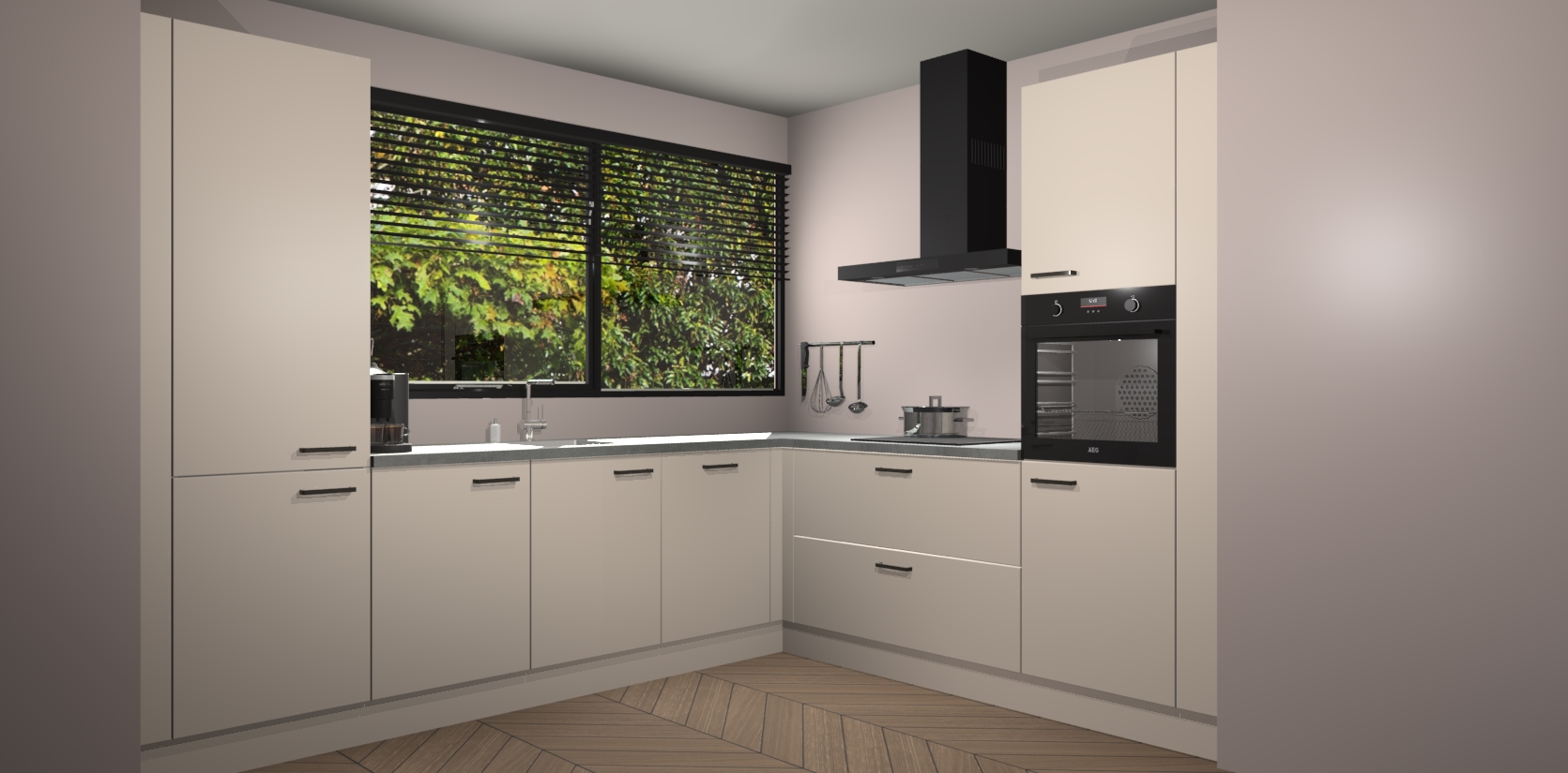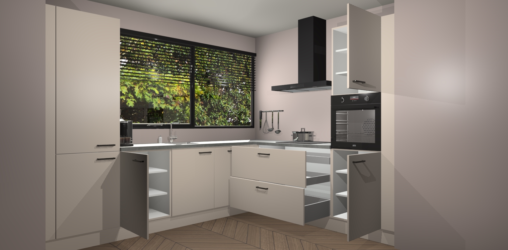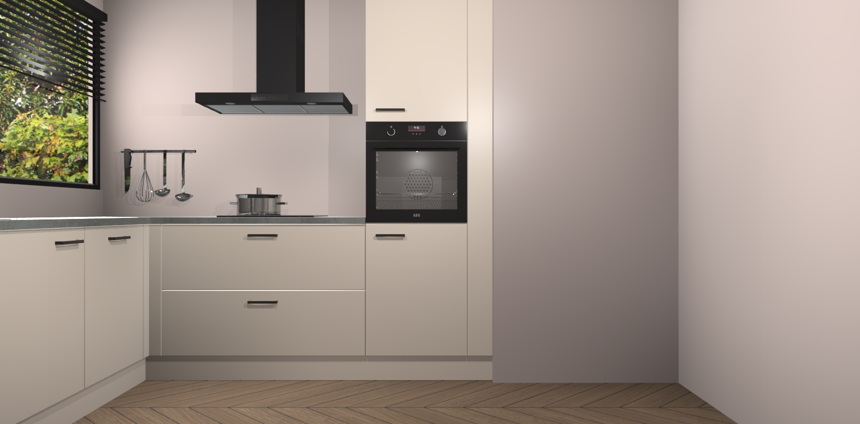 Met een modern, tijdloos design en ruime opslagruimte, zult u zich in no-time thuis voelen in uw nieuwe keuken. Uw leven wordt eenvoudiger met de soft-close deuren die voor het ultieme stille comfort zorgen - geen geluid dat u stoort terwijl u kookt. Ook is de keuken voorzien van 5 ingebouwde apparaten: een oven, inductie kookplaat, afzuigkap, vaatwasser en koelkast. Deze kunnen gemakkelijk na bestelling worden bijgewerkt naar AEG - waardoor uw luxe ervaring compleet is.