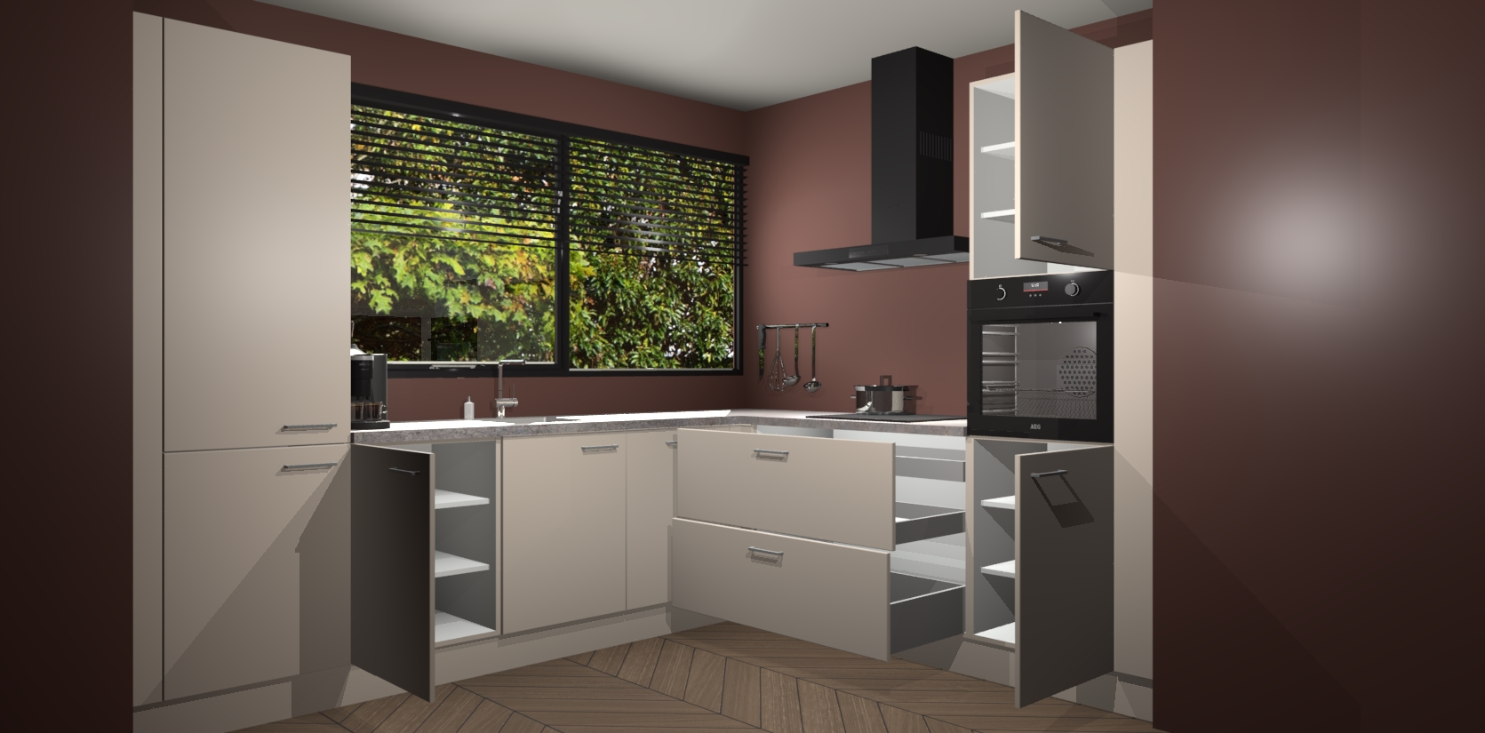 Met een modern, tijdloos design en ruime opslagruimte, zult u zich in no-time thuis voelen in uw nieuwe keuken. Uw leven wordt eenvoudiger met de soft-close deuren die voor het ultieme stille comfort zorgen - geen geluid dat u stoort terwijl u kookt. Ook is de keuken voorzien van 5 ingebouwde apparaten: een oven, inductie kookplaat, afzuigkap, vaatwasser en koelkast. Deze kunnen gemakkelijk na bestelling worden bijgewerkt naar AEG - waardoor uw luxe ervaring compleet is.