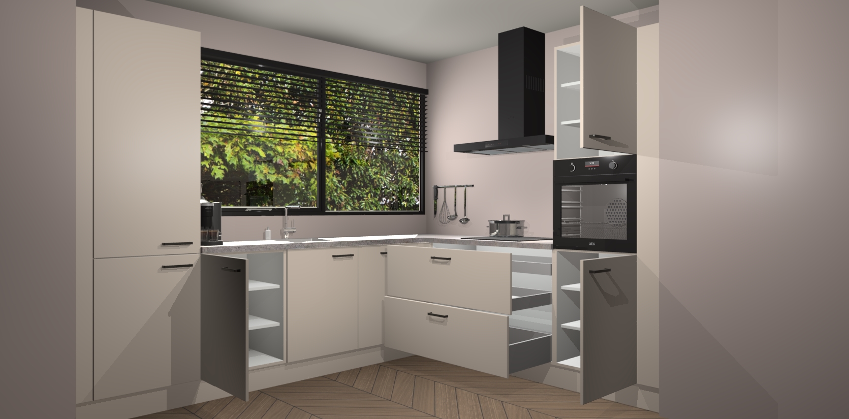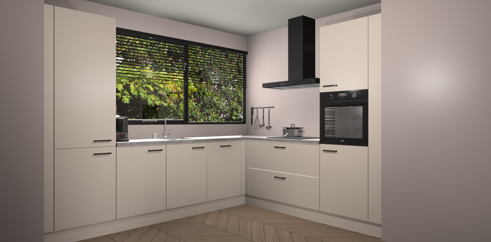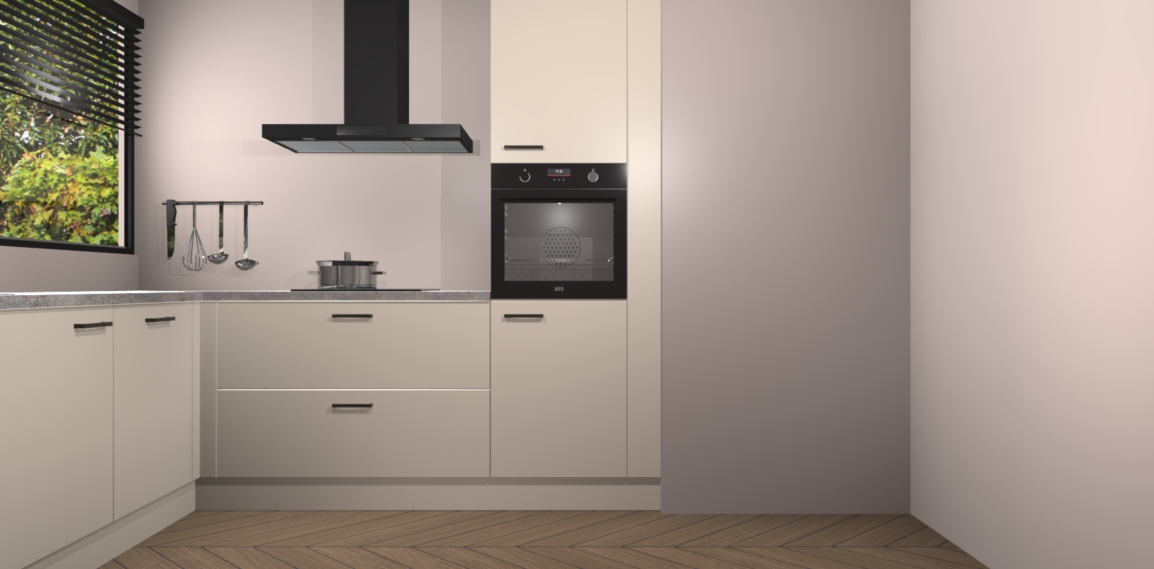 Met een modern, tijdloos design en ruime opslagruimte, zult u zich in no-time thuis voelen in uw nieuwe keuken. Uw leven wordt eenvoudiger met de soft-close deuren die voor het ultieme stille comfort zorgen - geen geluid dat u stoort terwijl u kookt. Ook is de keuken voorzien van 5 ingebouwde apparaten: een oven, inductie kookplaat, afzuigkap, vaatwasser en koelkast. Deze kunnen gemakkelijk na bestelling worden bijgewerkt naar AEG - waardoor uw luxe ervaring compleet is.