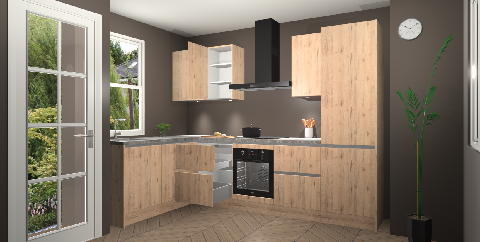 Bent u op zoek naar een strakke, moderne hoekkeuken die uw huis oppept en een moderne uitstraling geeft? Kijk dan niet verder dan de madera natuur greeploze keuken Beijing. Deze verbluffende hoekkeuken tilt hedendaags design naar een hoger niveau. Qua stijl is deze chique hoekkeuken voorzien van madera natuur accenten, om een strakke maar opvallende look te creëren. De binnenkant van de kasten is afgewerkt in dezelfde prachtige madera natuur kleur voor extra esthetische aantrekkingskracht.