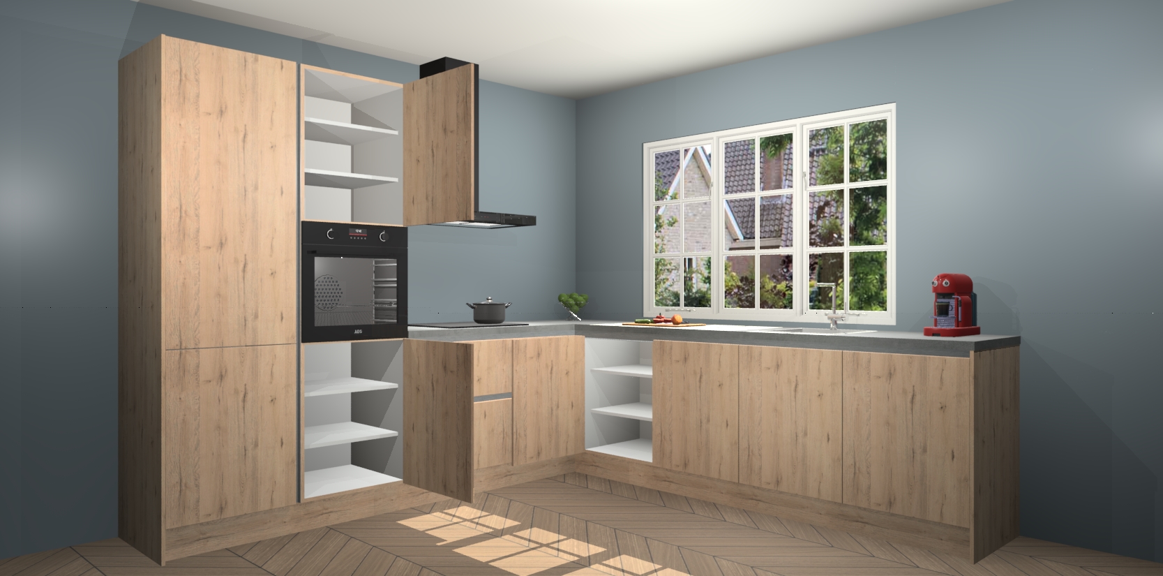 De keuken heeft veel opbergruimte, waardoor u alle ingrediënten gemakkelijk bereikbaar hebt staan. En daarnaast bevat deze volledig uitgeruste keuken ook 5 ingebouwde apparaten: een oven, inductiekookplaat, afzuigkap, vaatwasser en koelkast. Deze zijn heel eenvoudig na bestellen te upgraden naar AEG als u dit wilt. Bovendien zijn de softclose-kastdeuren ideaal; geef ze gewoon even een tikje en ze sluiten automatisch met geruisloze precisie.
