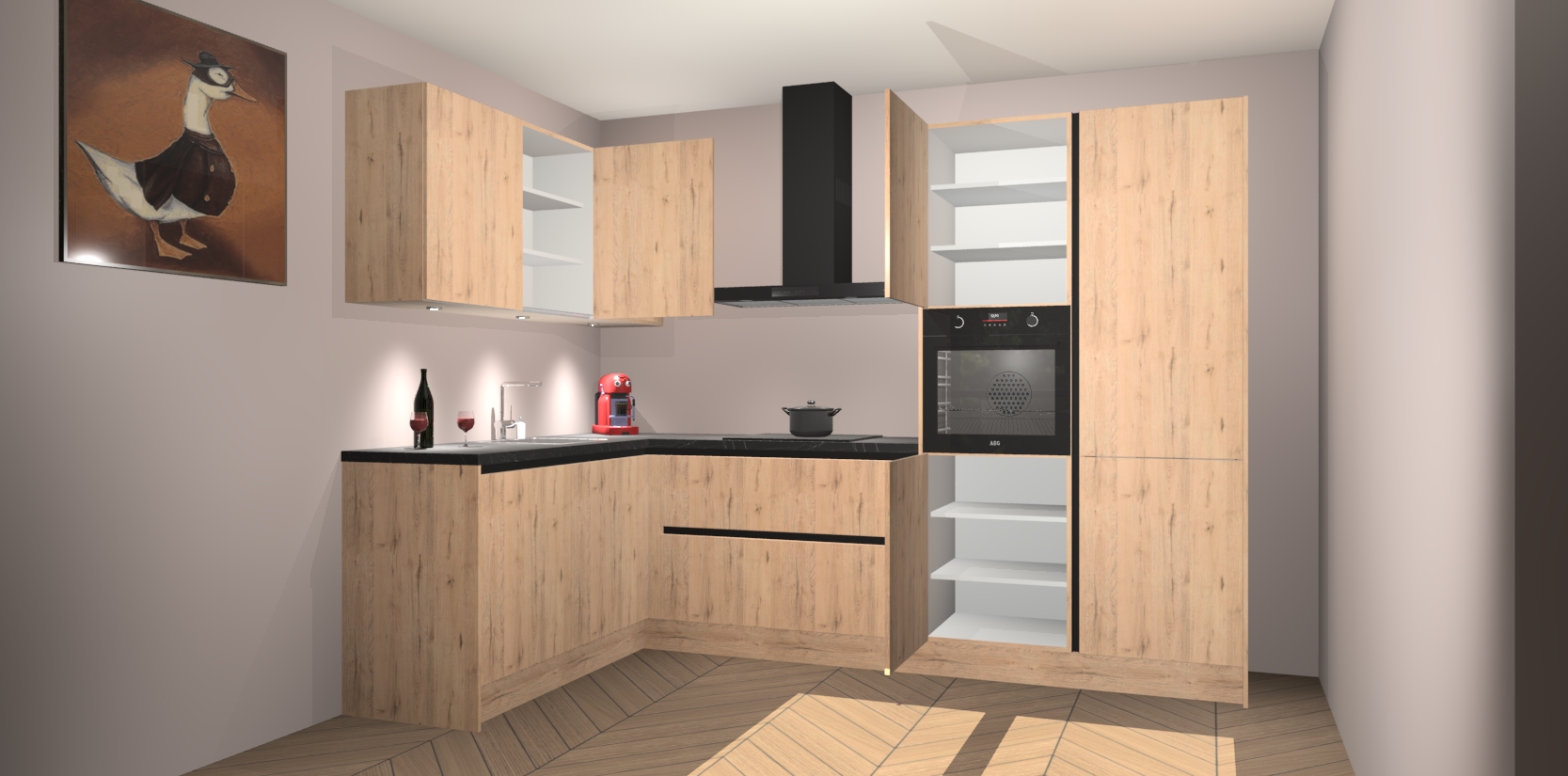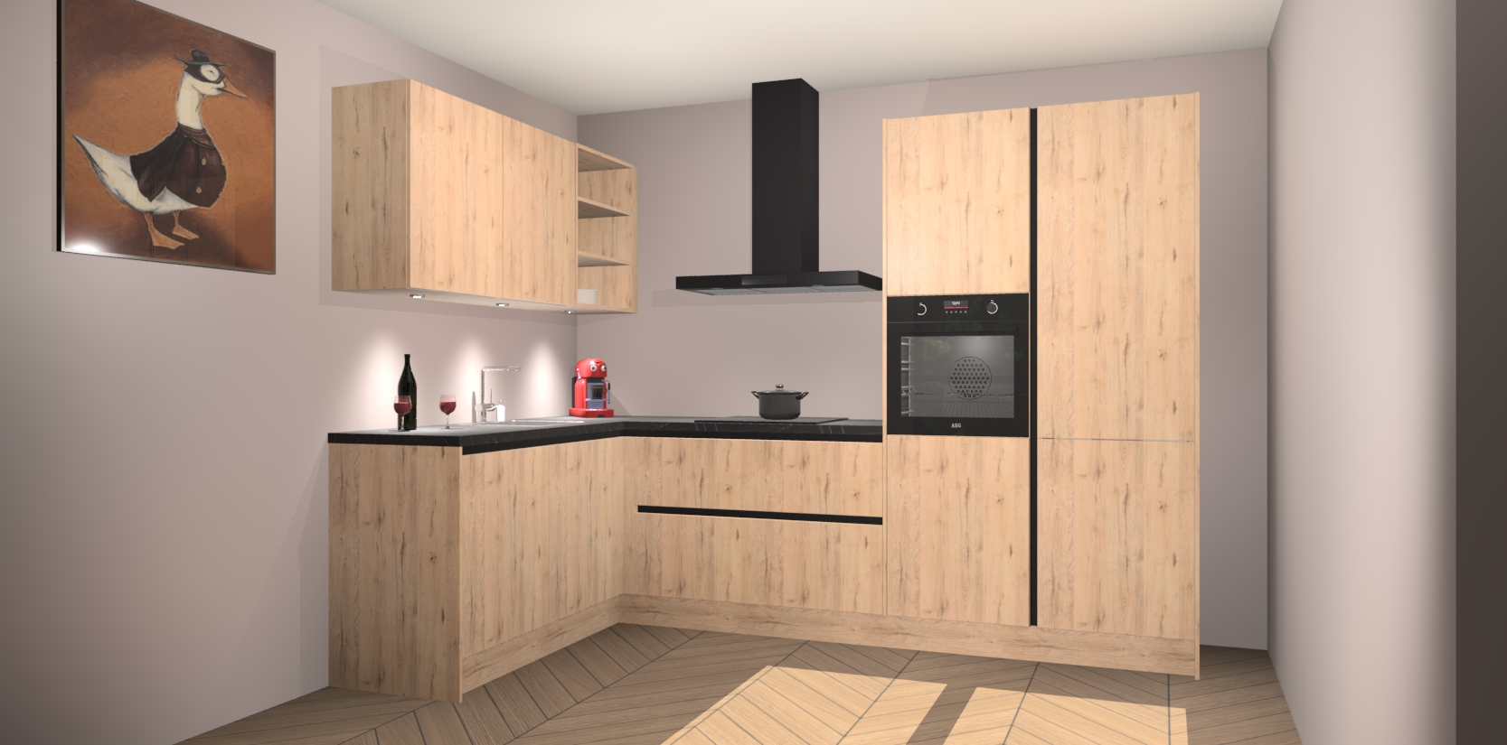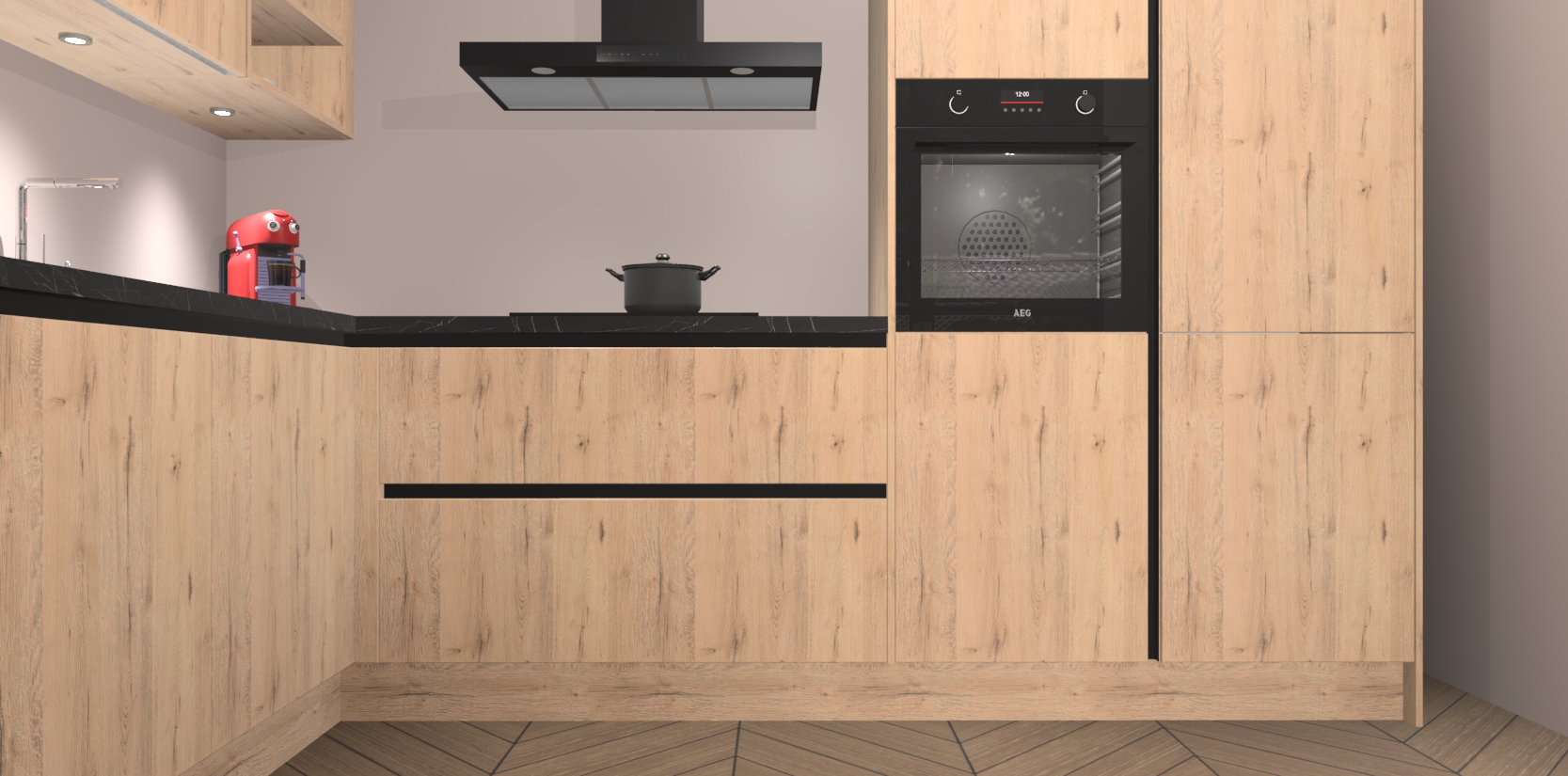 De Madera Natuur greeploze keuken Cognac is een adembenemend ontwerp met een modern en tijdloos uiterlijk. Deze luxe keuken straalt echt aristocratisch uit, waardoor uw koken plezieriger zal worden! Het prachtige design begint bij de hoekkeuken, wat perfect past bij elk type interieur. Bovendien bevat deze hoogwaardige set vijf inbouwapparaten - van oven tot koelkast - die via bestelling naar AEG geüpgraded kunnen worden!