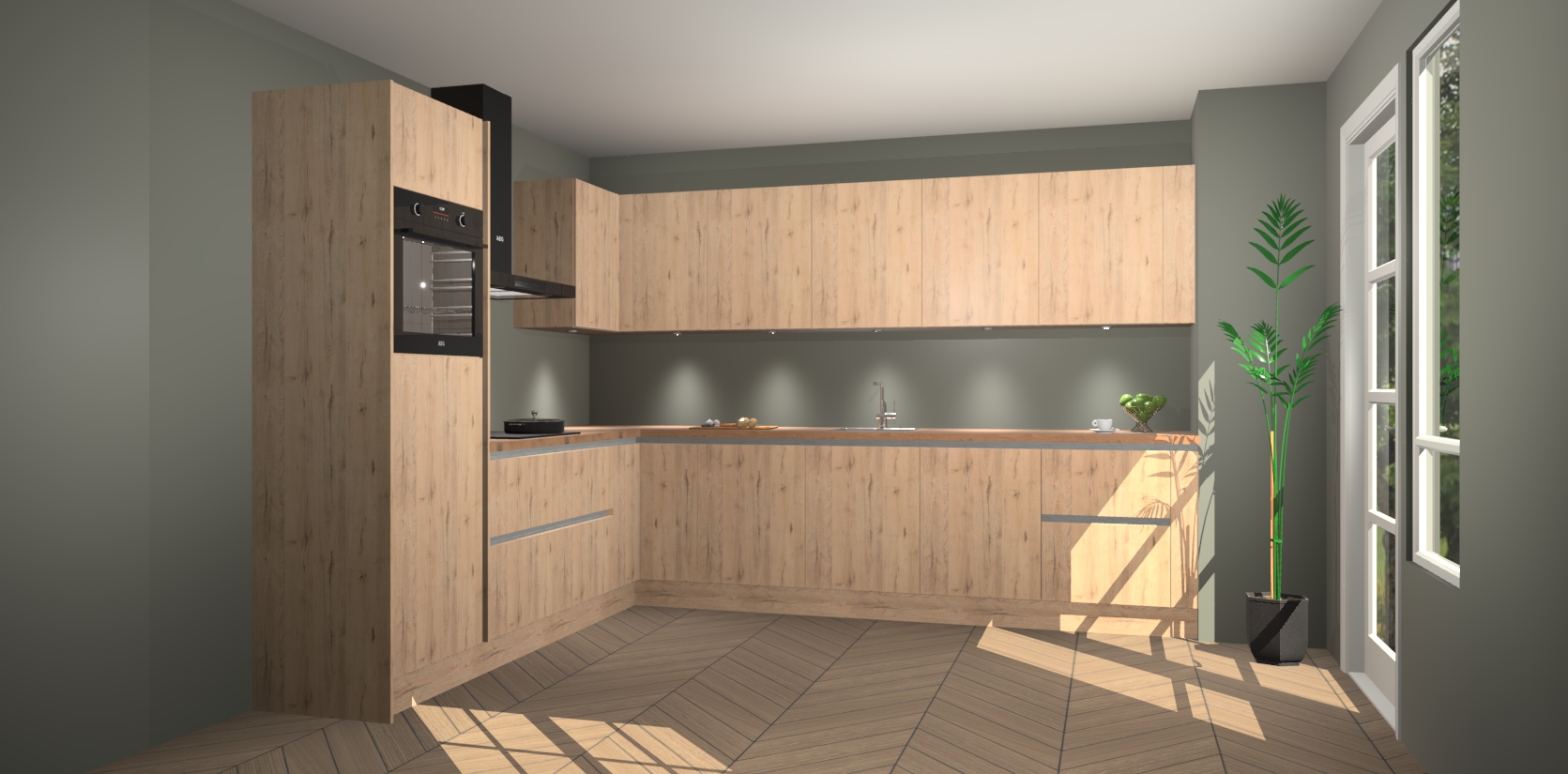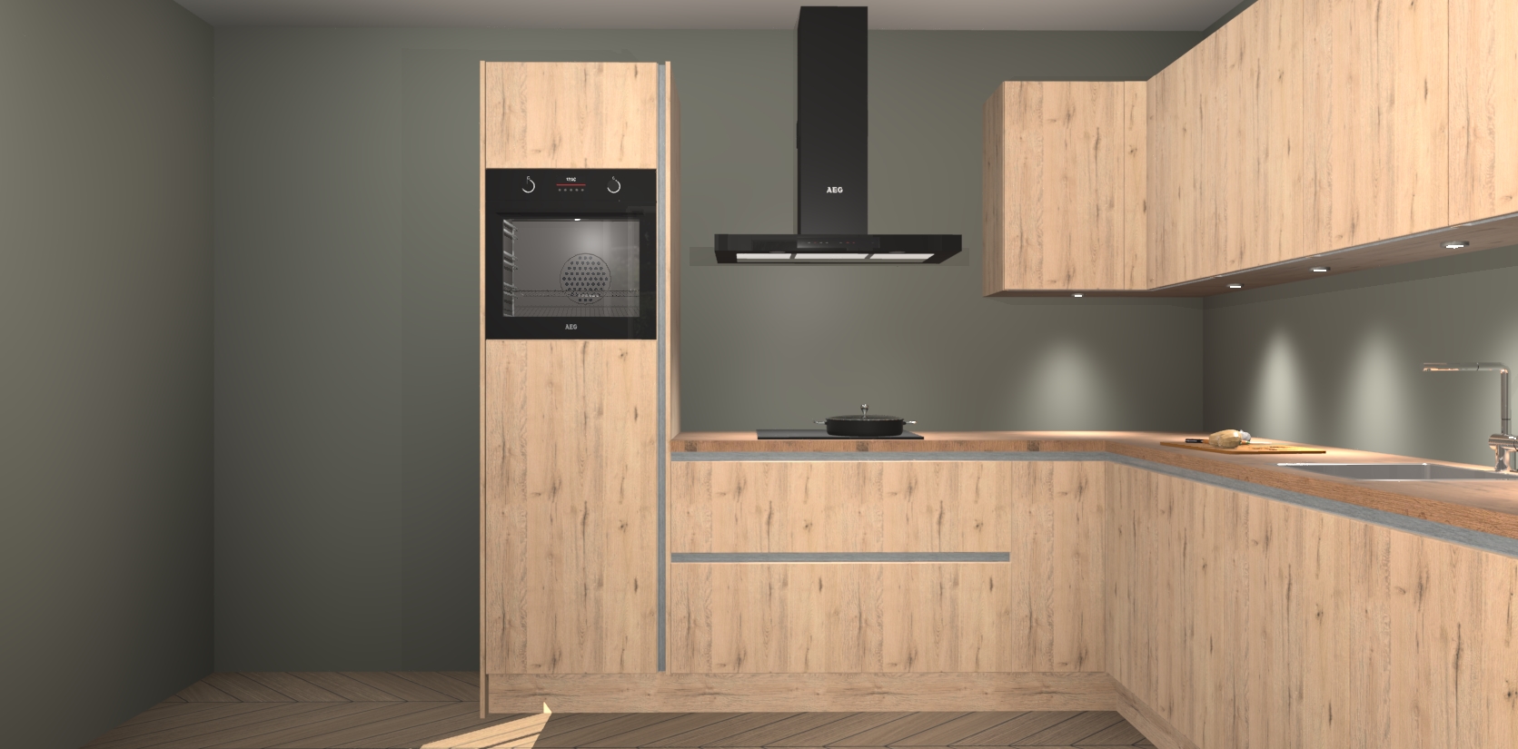 De Madera Natuur greeploze keuken Debar is uitgerust met vijf inbouwapparaten die elke kooktaak handig en efficiënt maken. Een oven, inductiekookplaat, afzuigkap, vaatwasser en koelkast zijn standaard, maar kunnen na bestelling eenvoudig worden geupgrade naar AEG. Profiteer vervolgens van de softclose deuren voor snelle toegang en geruisloze toegang.