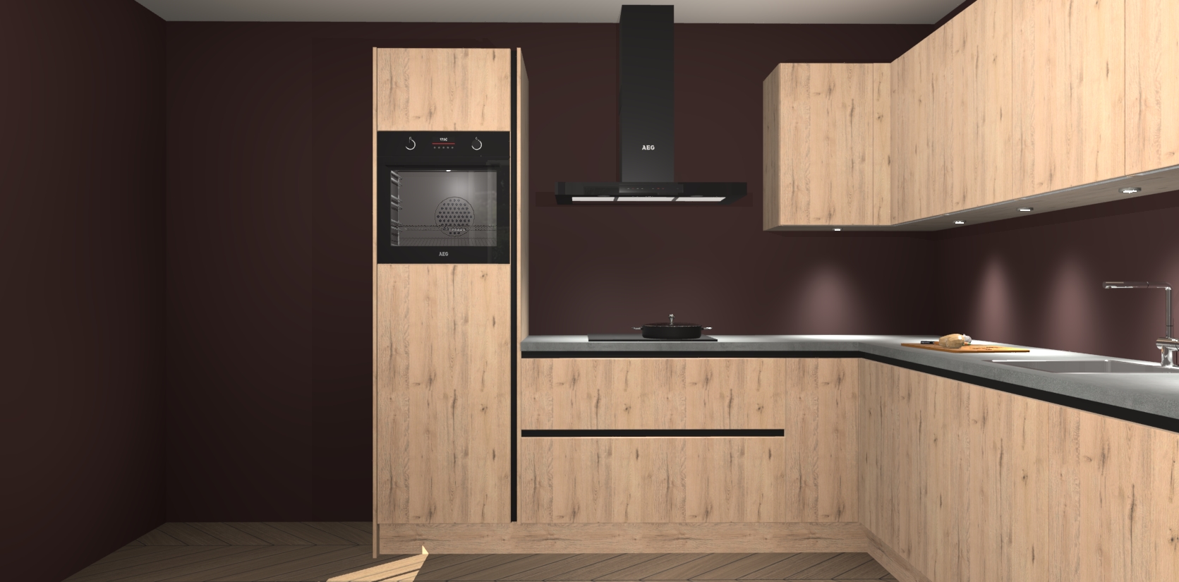De Madera Natuur greeploze keuken Debar is uitgerust met vijf inbouwapparaten die elke kooktaak handig en efficiënt maken. Een oven, inductiekookplaat, afzuigkap, vaatwasser en koelkast zijn standaard, maar kunnen na bestelling eenvoudig worden geupgrade naar AEG. Profiteer vervolgens van de softclose deuren voor snelle toegang en geruisloze toegang.