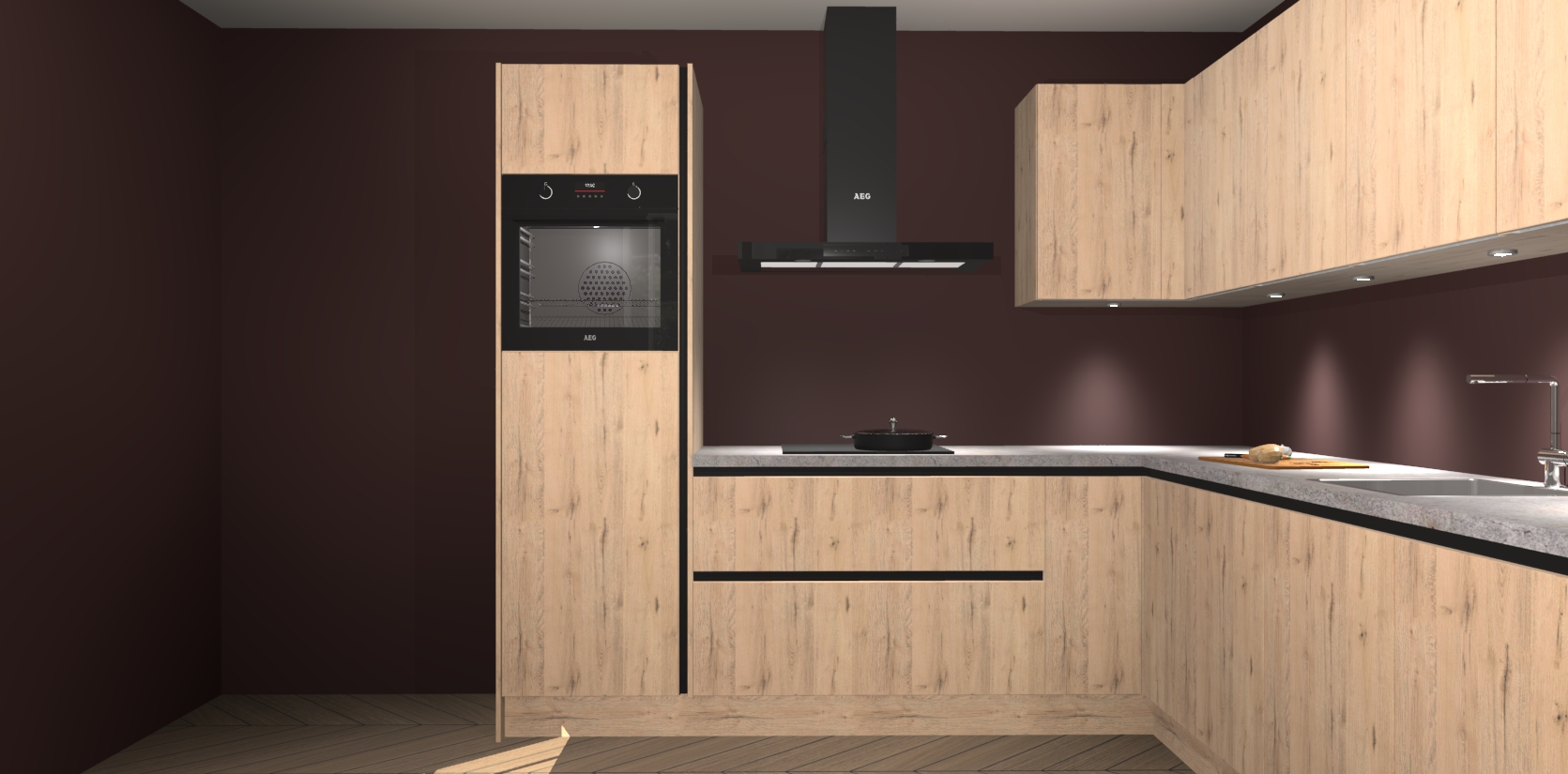 De Madera Natuur greeploze keuken Debar is uitgerust met vijf inbouwapparaten die elke kooktaak handig en efficiënt maken. Een oven, inductiekookplaat, afzuigkap, vaatwasser en koelkast zijn standaard, maar kunnen na bestelling eenvoudig worden geupgrade naar AEG. Profiteer vervolgens van de softclose deuren voor snelle toegang en geruisloze toegang.