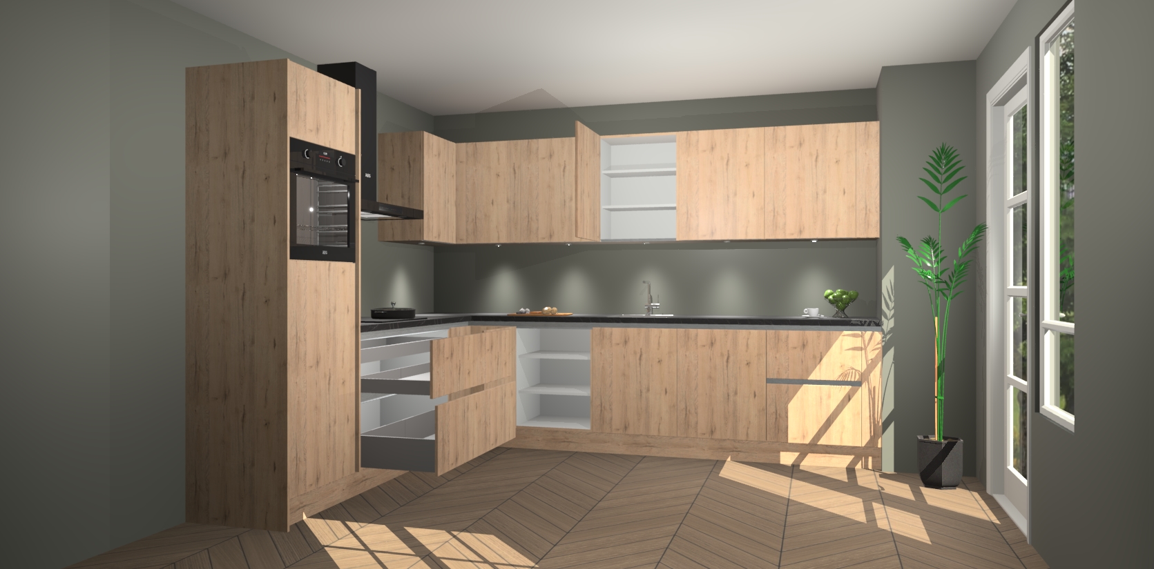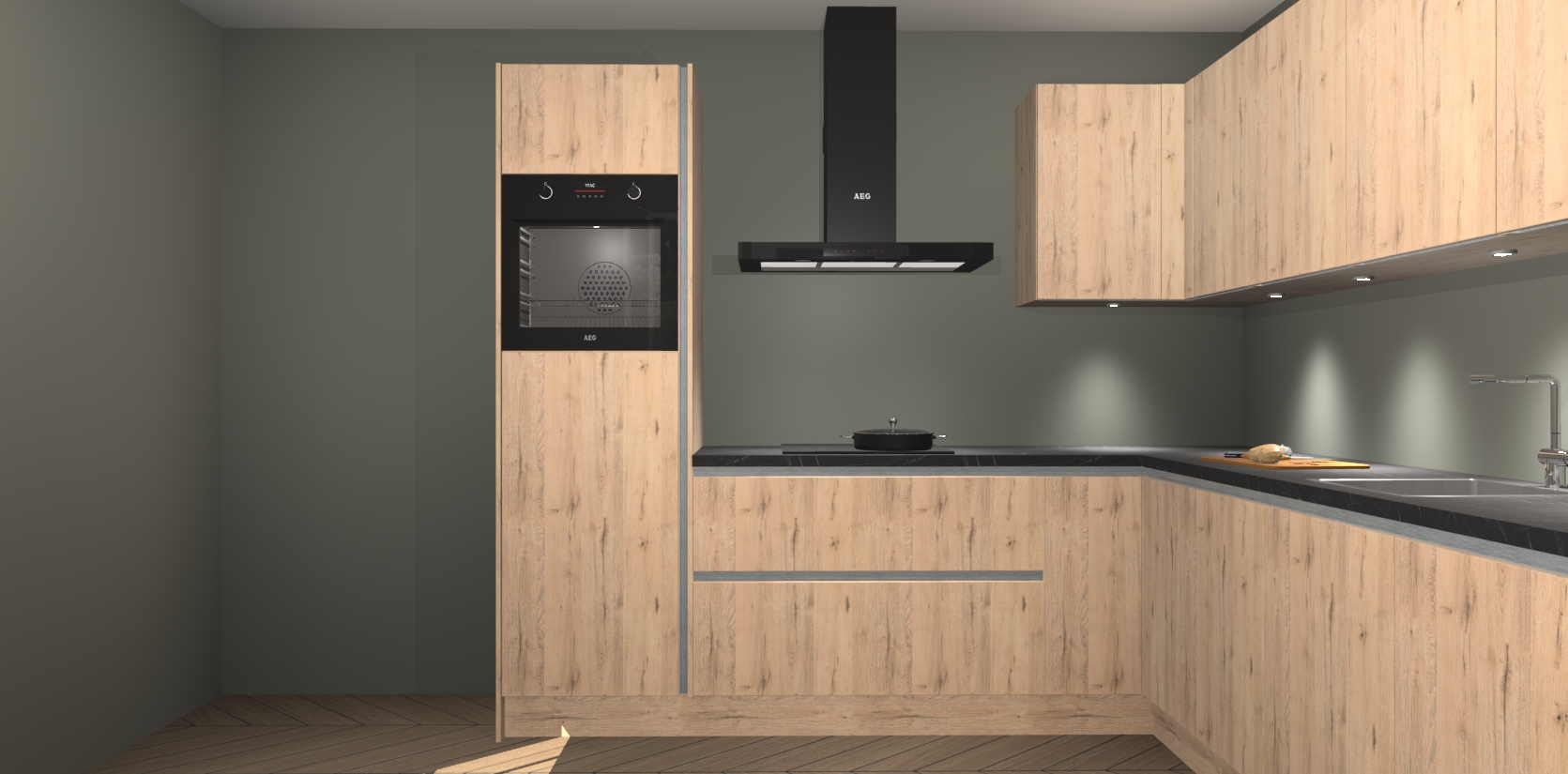 De Madera Natuur greeploze keuken Debar is uitgerust met vijf inbouwapparaten die elke kooktaak handig en efficiënt maken. Een oven, inductiekookplaat, afzuigkap, vaatwasser en koelkast zijn standaard, maar kunnen na bestelling eenvoudig worden geupgrade naar AEG. Profiteer vervolgens van de softclose deuren voor snelle toegang en geruisloze toegang.