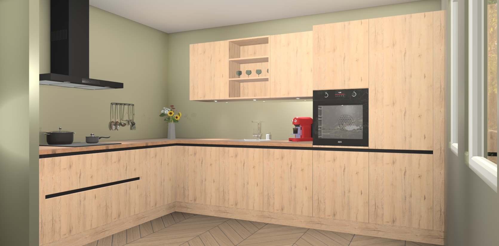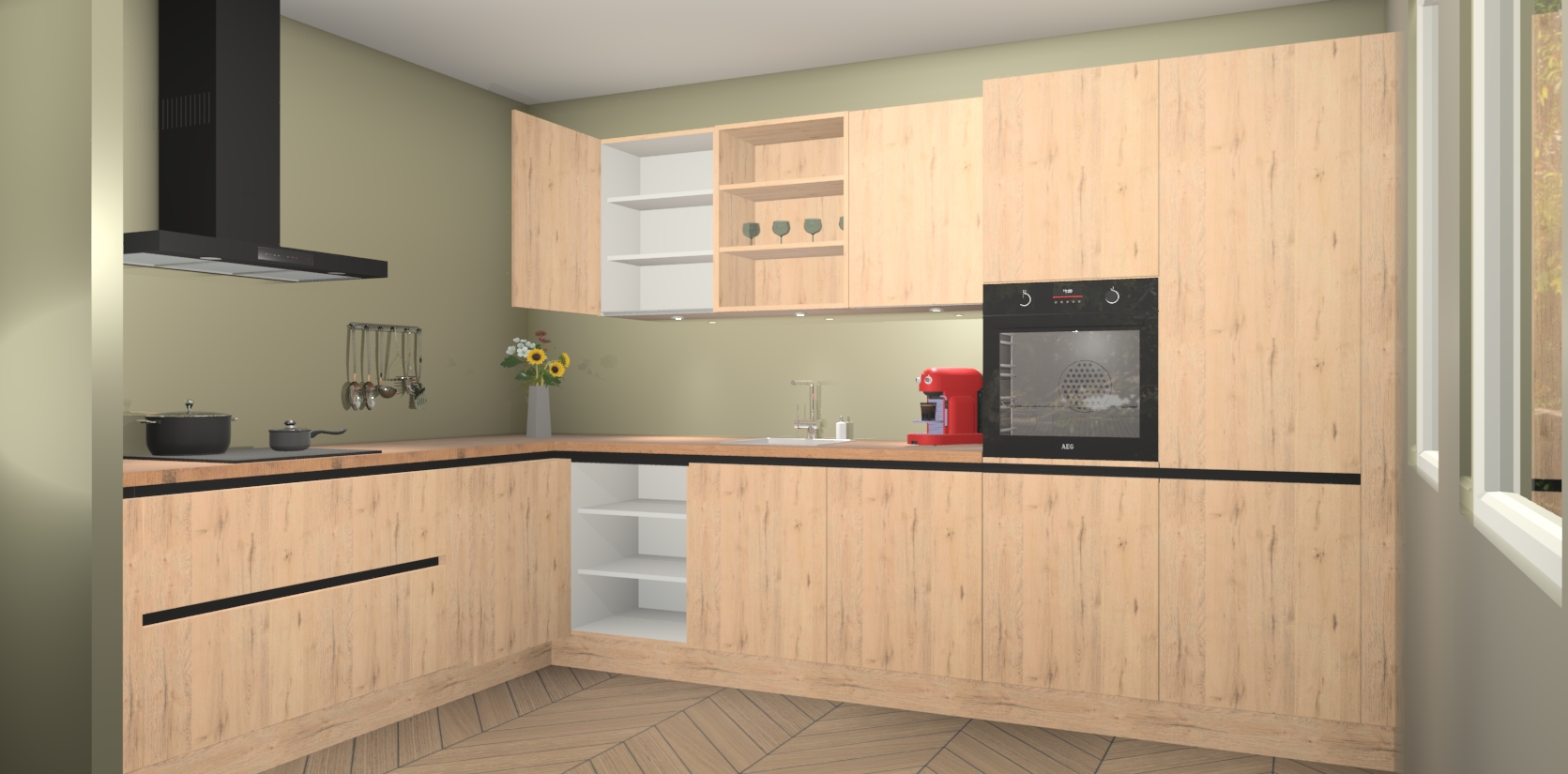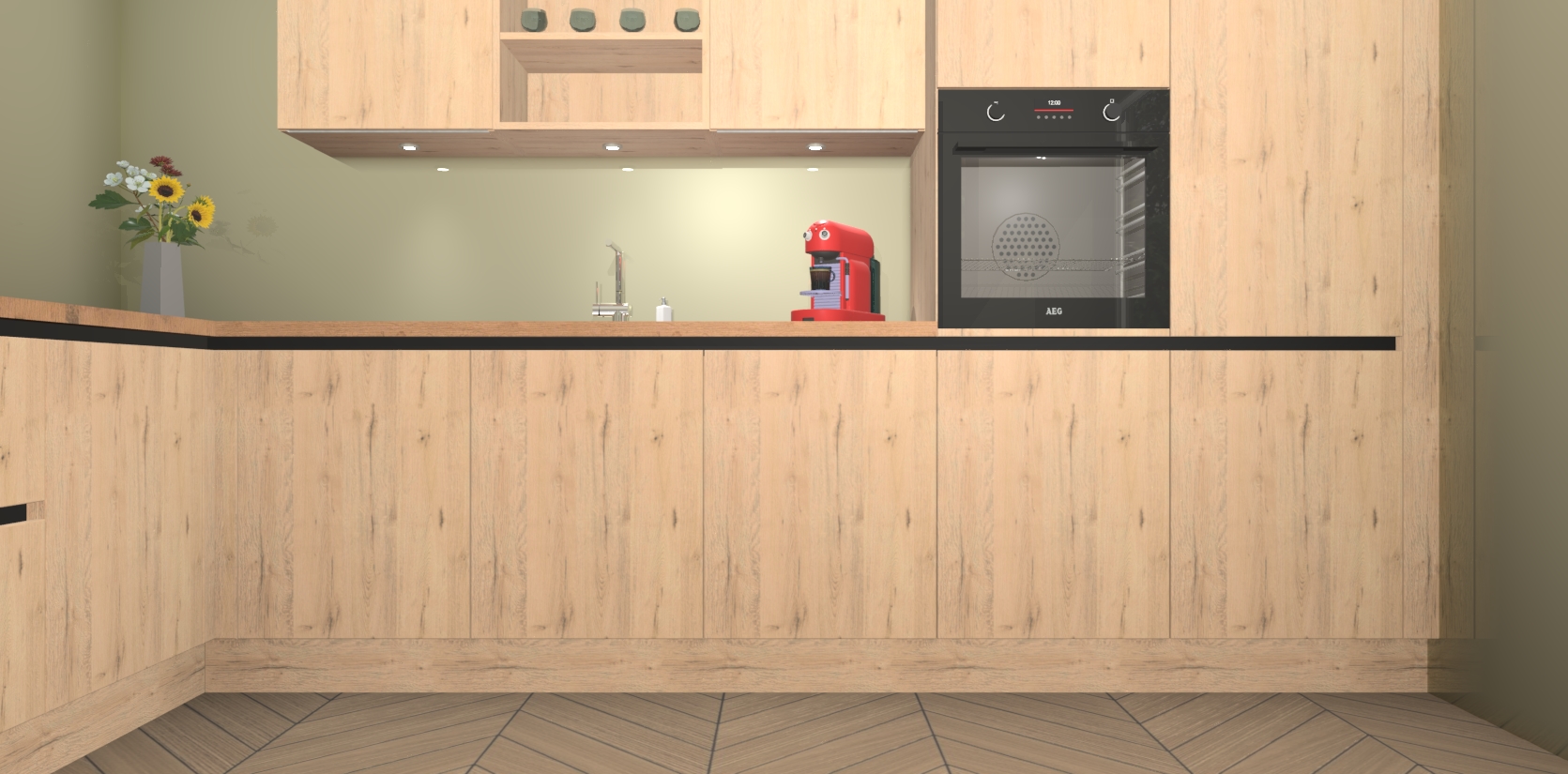 Over opbergruimte hoeft u zich ook geen zorgen te maken! Er is voldoende ruimte voor al uw culinaire behoeftes. Plus, we hebben al 5 inbouwapparaten meegeleverd die gemakkelijk na uw bestelling te upgraden zijn naar AEG: een oven, inductiekookplaat, afzuigkap, vaatwasser en koelkast. En maakt u zich geen zorgen - alle deuren sluiten zacht, dus u hoeft zich geen zorgen te maken over dichtslaande deuren of lawaai terwijl u kookt.