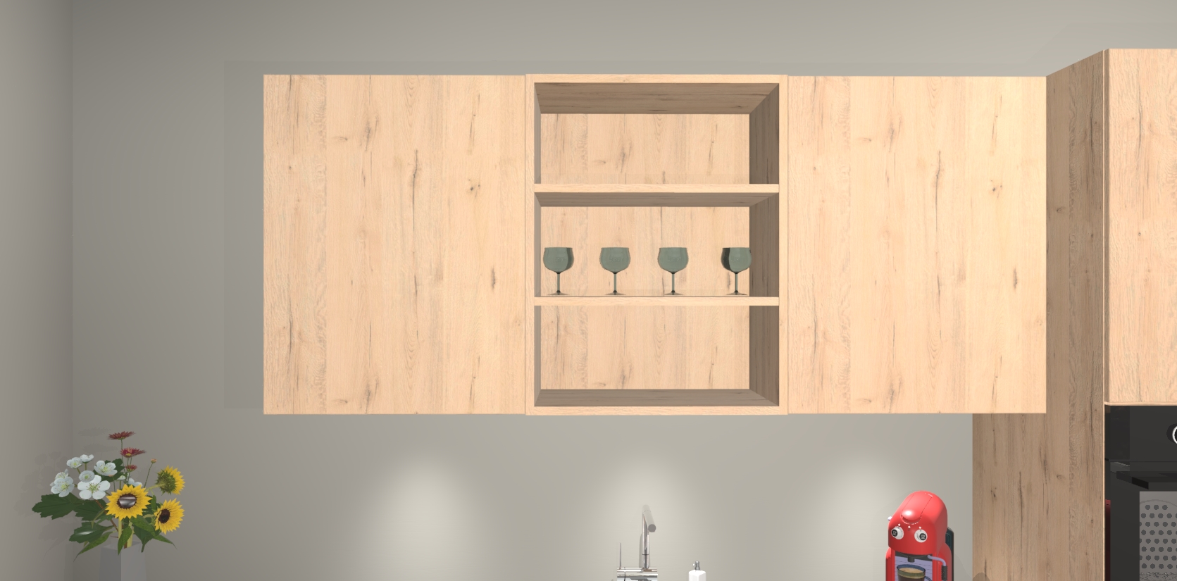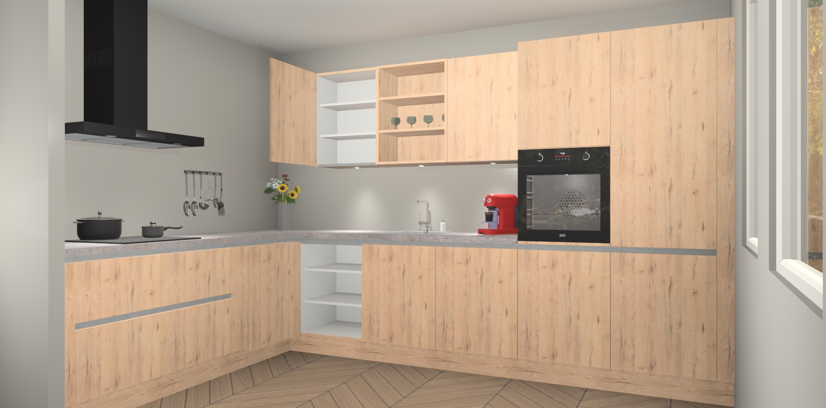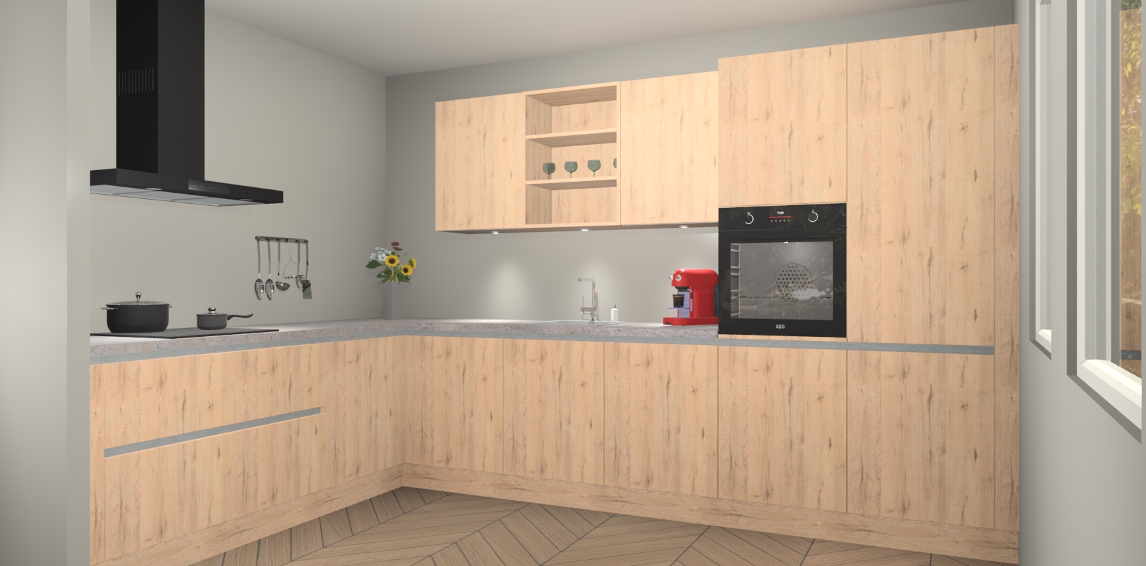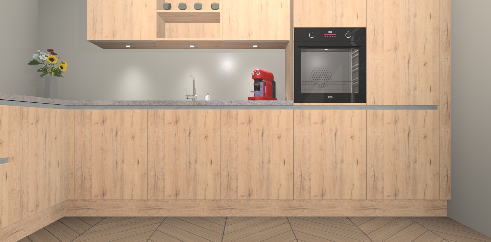 Over opbergruimte hoeft u zich ook geen zorgen te maken! Er is voldoende ruimte voor al uw culinaire behoeftes. Plus, we hebben al 5 inbouwapparaten meegeleverd die gemakkelijk na uw bestelling te upgraden zijn naar AEG: een oven, inductiekookplaat, afzuigkap, vaatwasser en koelkast. En maakt u zich geen zorgen - alle deuren sluiten zacht, dus u hoeft zich geen zorgen te maken over dichtslaande deuren of lawaai terwijl u kookt.