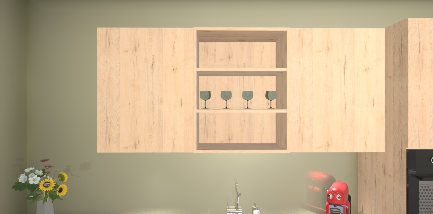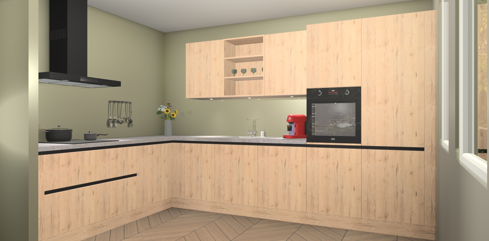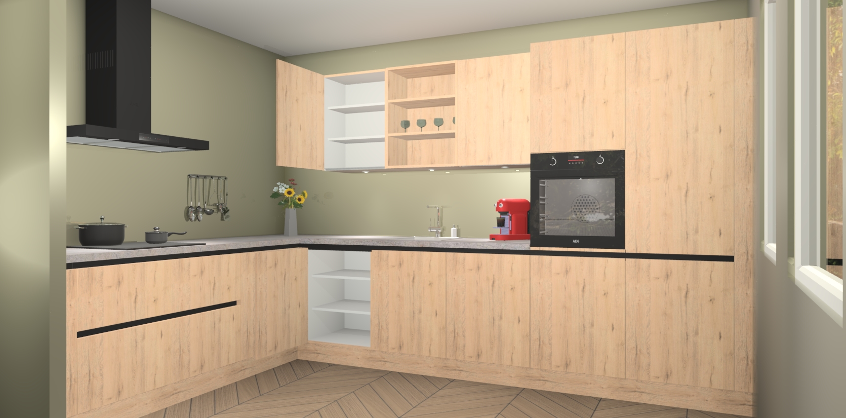 Over opbergruimte hoeft u zich ook geen zorgen te maken! Er is voldoende ruimte voor al uw culinaire behoeftes. Plus, we hebben al 5 inbouwapparaten meegeleverd die gemakkelijk na uw bestelling te upgraden zijn naar AEG: een oven, inductiekookplaat, afzuigkap, vaatwasser en koelkast. En maakt u zich geen zorgen - alle deuren sluiten zacht, dus u hoeft zich geen zorgen te maken over dichtslaande deuren of lawaai terwijl u kookt.