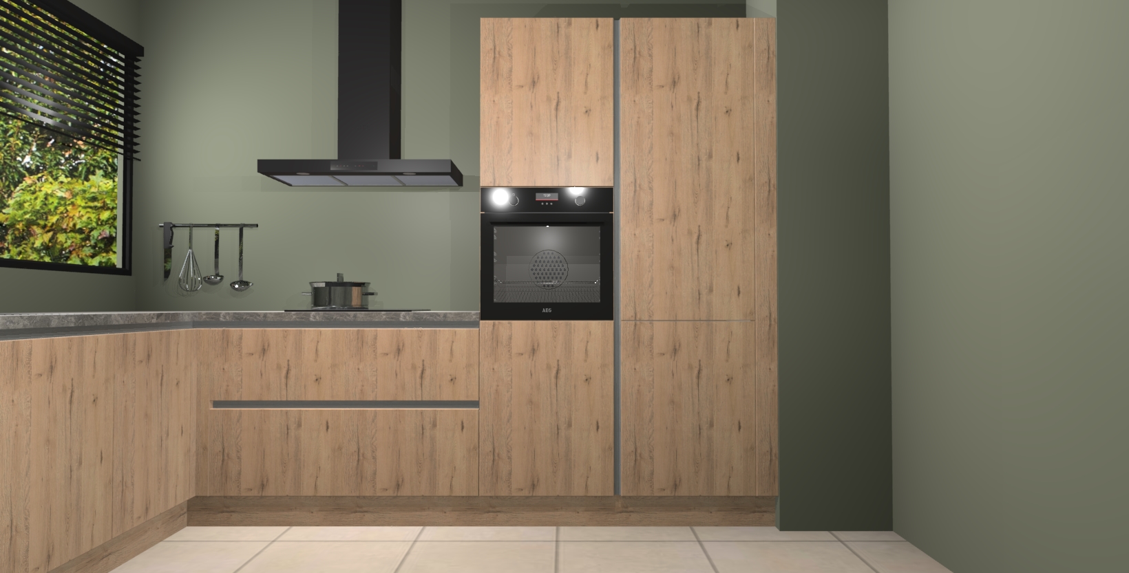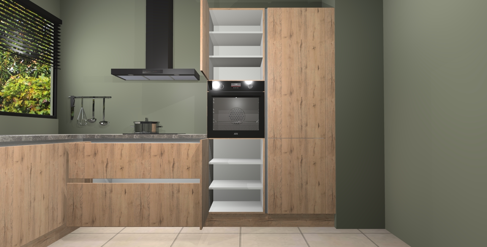 Met een modern, tijdloos design en ruime opslagruimte, zult u zich in no-time thuis voelen in uw nieuwe keuken. Uw leven wordt eenvoudiger met de soft-close deuren die voor het ultieme stille comfort zorgen - geen geluid dat u stoort terwijl u kookt. Ook is de keuken voorzien van 5 ingebouwde apparaten: een oven, inductie kookplaat, afzuigkap, vaatwasser en koelkast. Deze kunnen gemakkelijk na bestelling worden bijgewerkt naar AEG - waardoor uw luxe ervaring compleet is.