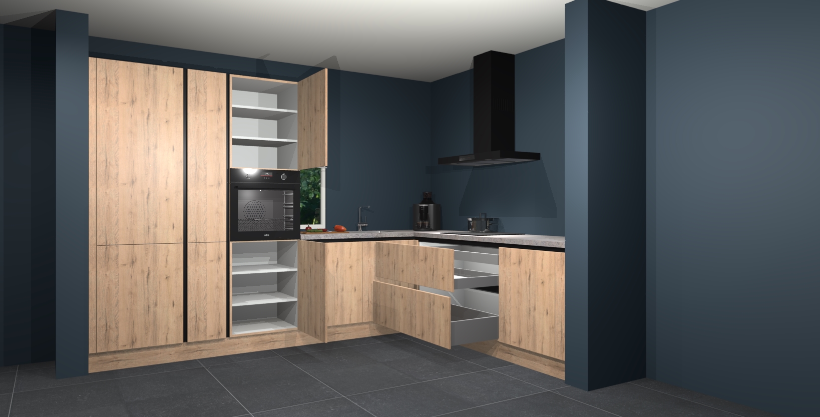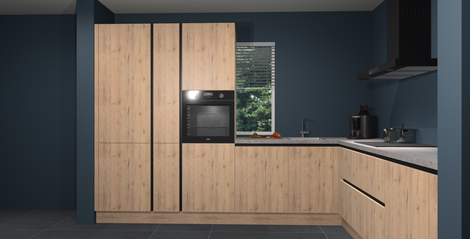 Met een modern, tijdloos design en ruime opslagruimte, zult u zich in no-time thuis voelen in uw nieuwe keuken. Uw leven wordt eenvoudiger met de soft-close deuren die voor het ultieme stille comfort zorgen - geen geluid dat u stoort terwijl u kookt. Ook is de keuken voorzien van 5 ingebouwde apparaten: een oven, inductie kookplaat, afzuigkap, vaatwasser en koelkast. Deze kunnen gemakkelijk na bestelling worden bijgewerkt naar AEG - waardoor uw luxe ervaring compleet is.