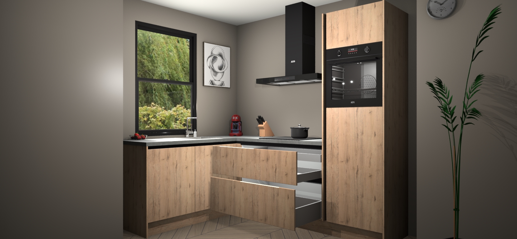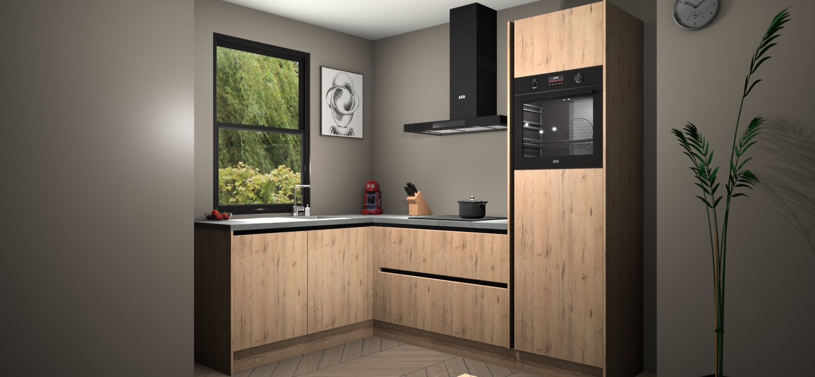 Deze prachtige hoekkeuken heeft alle benodigdheden om uw droomkook- en eetruimte compleet te maken. De Madera Natuur kasten bieden een echo van raffinement, terwijl de 5 inbouwapparaten genoeg opties bieden voor het bereiden van heerlijke maaltijden. De oven, inductiekookplaat, afzuigkap, vaatwasser en koelkast zorgen ervoor dat u tijd in de keuken zo efficiënt mogelijk verloopt, terwijl ze ook dat extra vleugje luxe bieden.