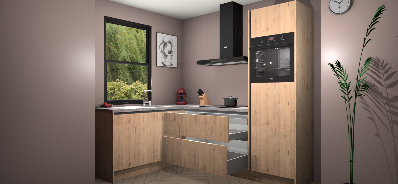 Deze prachtige hoekkeuken heeft alle benodigdheden om uw droomkook- en eetruimte compleet te maken. De Madera Natuur kasten bieden een echo van raffinement, terwijl de 5 inbouwapparaten genoeg opties bieden voor het bereiden van heerlijke maaltijden. De oven, inductiekookplaat, afzuigkap, vaatwasser en koelkast zorgen ervoor dat u tijd in de keuken zo efficiënt mogelijk verloopt, terwijl ze ook dat extra vleugje luxe bieden.