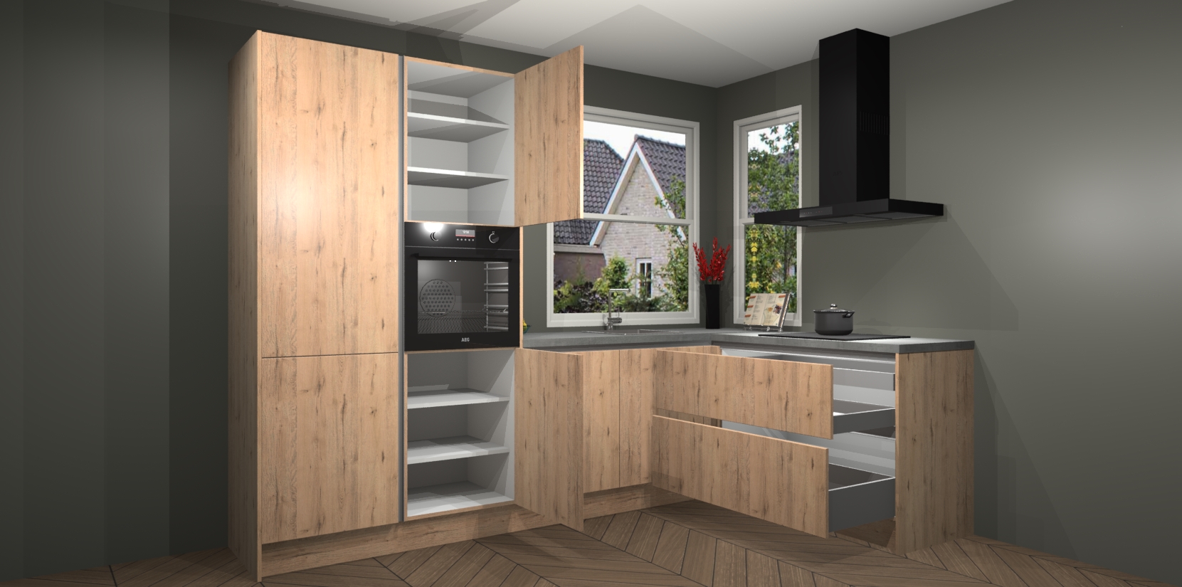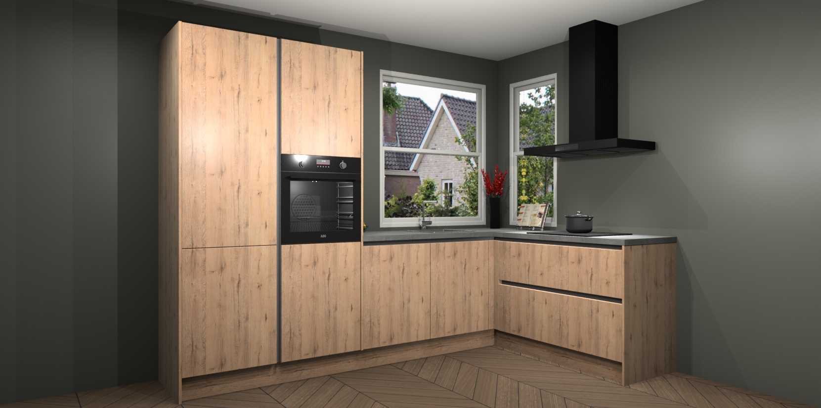 De Madera Natuur greeploze keuken Kotor wordt geleverd met vijf inbouwapparaten, waaronder een oven, inductiekookplaat, afzuigkap, vaatwasser en koelkast. En als u uw apparatuur wilt upgraden, kunnen we u na bestelling eenvoudig helpen overstappen naar AEG. Bovendien heeft deze keuken soft close deuren, zodat lades en kastjes geruisloos en zonder klepperen sluiten!