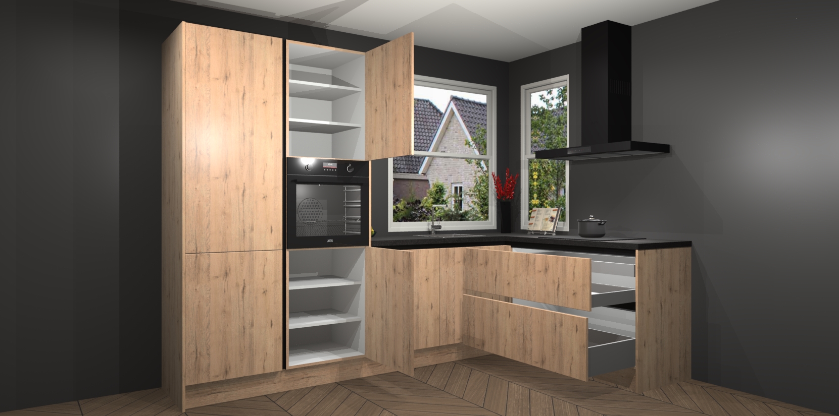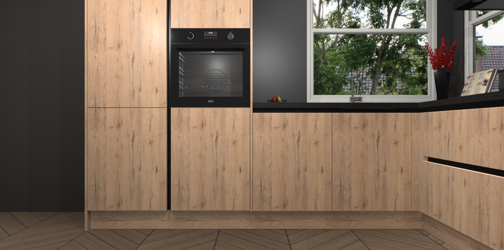 De Madera Natuur greeploze keuken Kotor wordt geleverd met vijf inbouwapparaten, waaronder een oven, inductiekookplaat, afzuigkap, vaatwasser en koelkast. En als u uw apparatuur wilt upgraden, kunnen we u na bestelling eenvoudig helpen overstappen naar AEG. Bovendien heeft deze keuken soft close deuren, zodat lades en kastjes geruisloos en zonder klepperen sluiten!