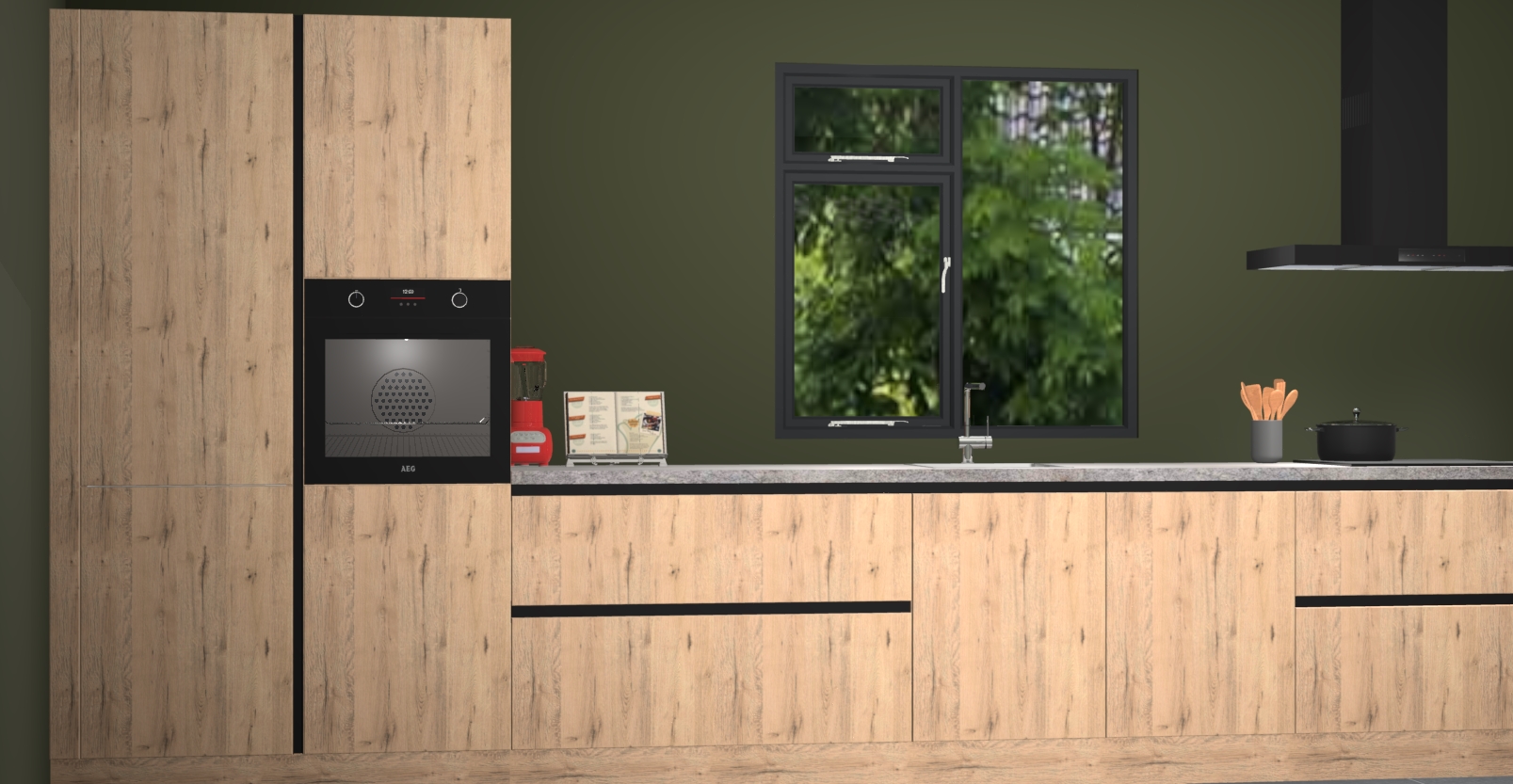 De Madera natuur keuken Lille wordt geleverd met vijf inbouwapparaten - een oven, inductiekookplaat, afzuigkap, vaatwasser en koelkast. Maar dat is nog niet alles! Na bestelling kunnen deze apparaten eenvoudig worden geüpgraded naar premium AEG-apparatuur. Bovendien is er zelfs de optie om de oven te vervangen door een combimagnetron of uw inductiekookplaat te vervangen door een kookplaat met geïntegreerde afzuiging.