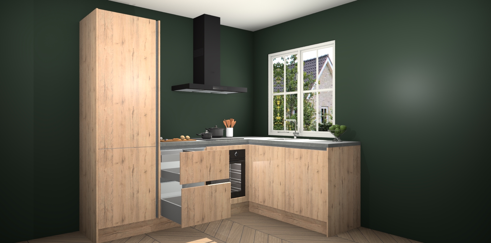 De Madera Natuur greeploze keuken Linz is de perfecte keuze voor uw nieuwe moderne en tijdloze keuken. Ga voor moderne en tijdloze elegantie in uw keuken. De prachtige hoekkeuken biedt een verfrissende kijk op de manier waarop we ons vertrouwde keukenontwerp kunnen aanpassen in een nieuwe stijl. Één blik om alles te zien: zo mooi dat het bijna magisch lijkt.