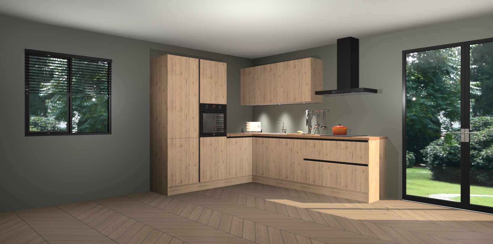 Met de madera natuur greeploze keuken Parla Maakt u van uw keuken het pronkstuk van uw huis. Stijlvol en toch praktisch, de nieuwste look voor wie meer waarde en charme aan zijn huis wil toevoegen. Met prachtige zwarte handgrepen die zich lenen voor een klassieke stijlbron, zal u niet teleurgesteld zijn in het resultaat. De soft-close deurscharnieren geven een gevoel van luxe omdat ze zachtjes bewegen zonder storende of krakende geluiden te veroorzaken.