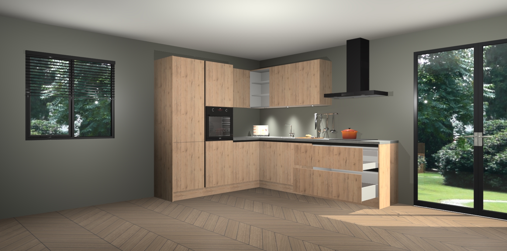 Met de madera natuur greeploze keuken Parla Maakt u van uw keuken het pronkstuk van uw huis. Stijlvol en toch praktisch, de nieuwste look voor wie meer waarde en charme aan zijn huis wil toevoegen. Met prachtige zwarte handgrepen die zich lenen voor een klassieke stijlbron, zal u niet teleurgesteld zijn in het resultaat. De soft-close deurscharnieren geven een gevoel van luxe omdat ze zachtjes bewegen zonder storende of krakende geluiden te veroorzaken.