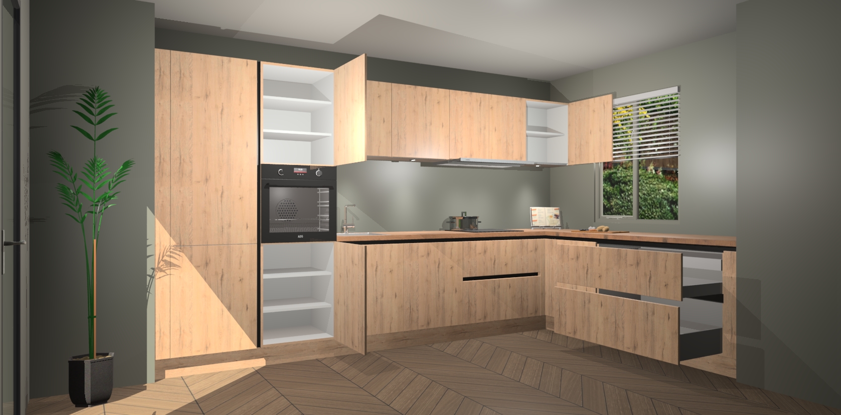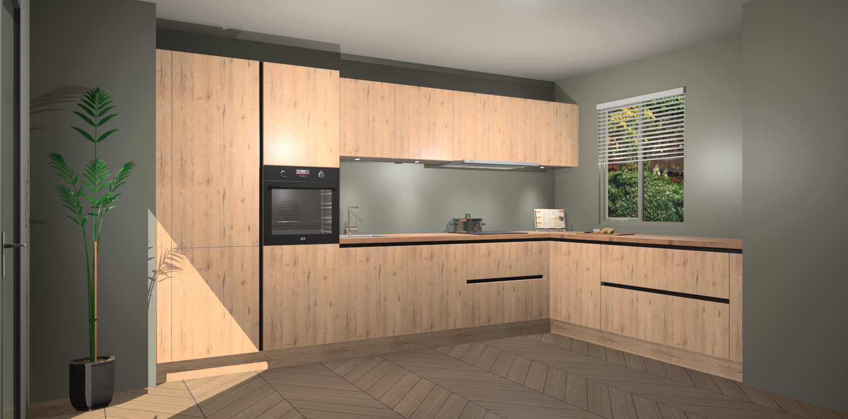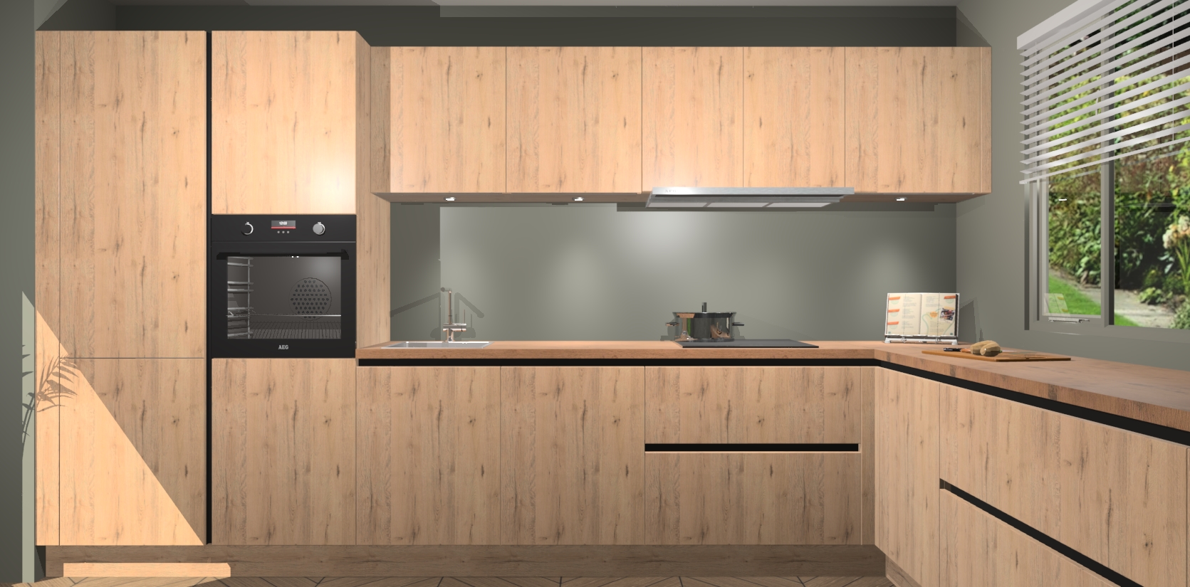 Verwelkom de natuurlijke warmte van de Madera Natuur greeploze keuken Petten in uw huis. Deze prachtige hoekkeuken met zijn moderne design en warme houten look geeft u meer dan genoeg opbergruimte om uw comfortabel te voelen in uw keuken. Geniet van soft-close deuren die al uw gasten het gevoel zullen geven dat ze zich in een luxueuze ruimte bevinden.