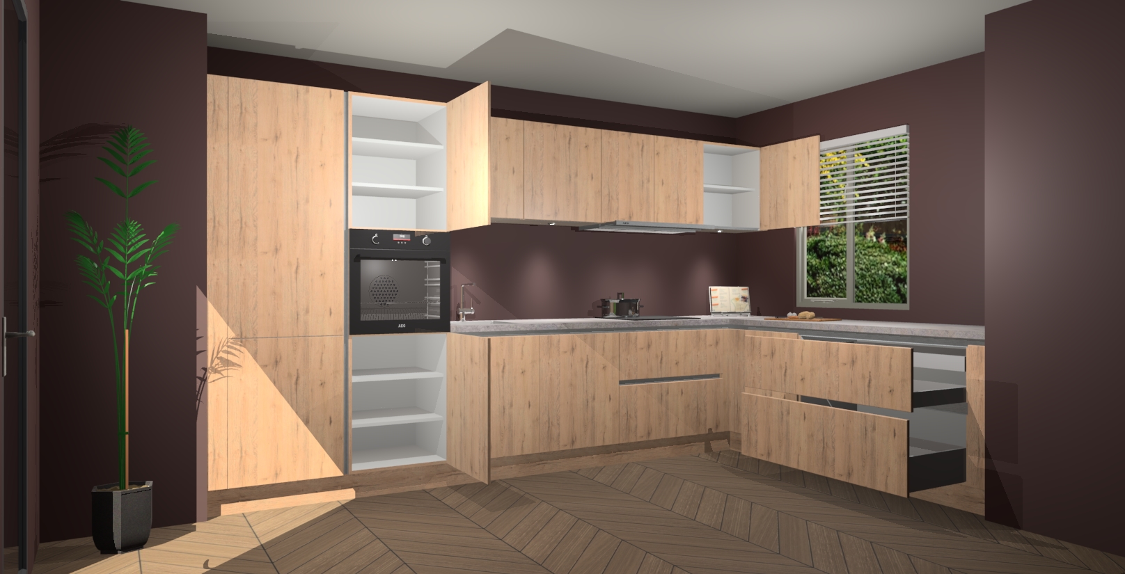 Verwelkom de natuurlijke warmte van de Madera Natuur greeploze keuken Petten in uw huis. Deze prachtige hoekkeuken met zijn moderne design en warme houten look geeft u meer dan genoeg opbergruimte om uw comfortabel te voelen in uw keuken. Geniet van soft-close deuren die al uw gasten het gevoel zullen geven dat ze zich in een luxueuze ruimte bevinden.