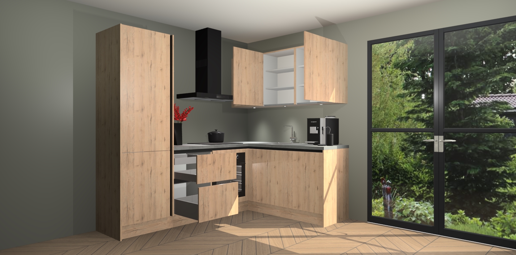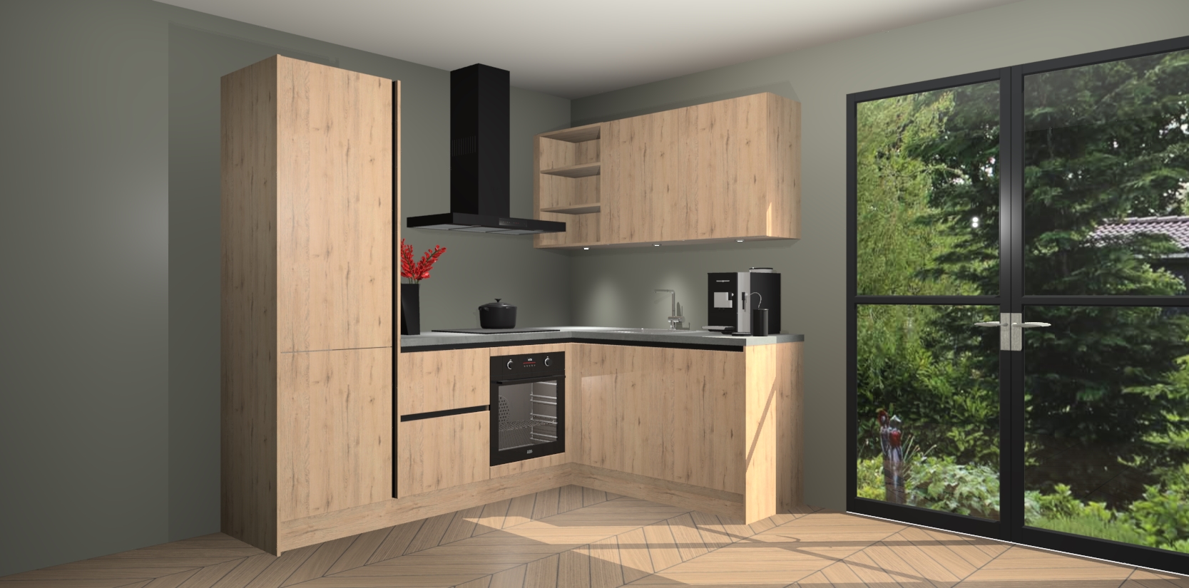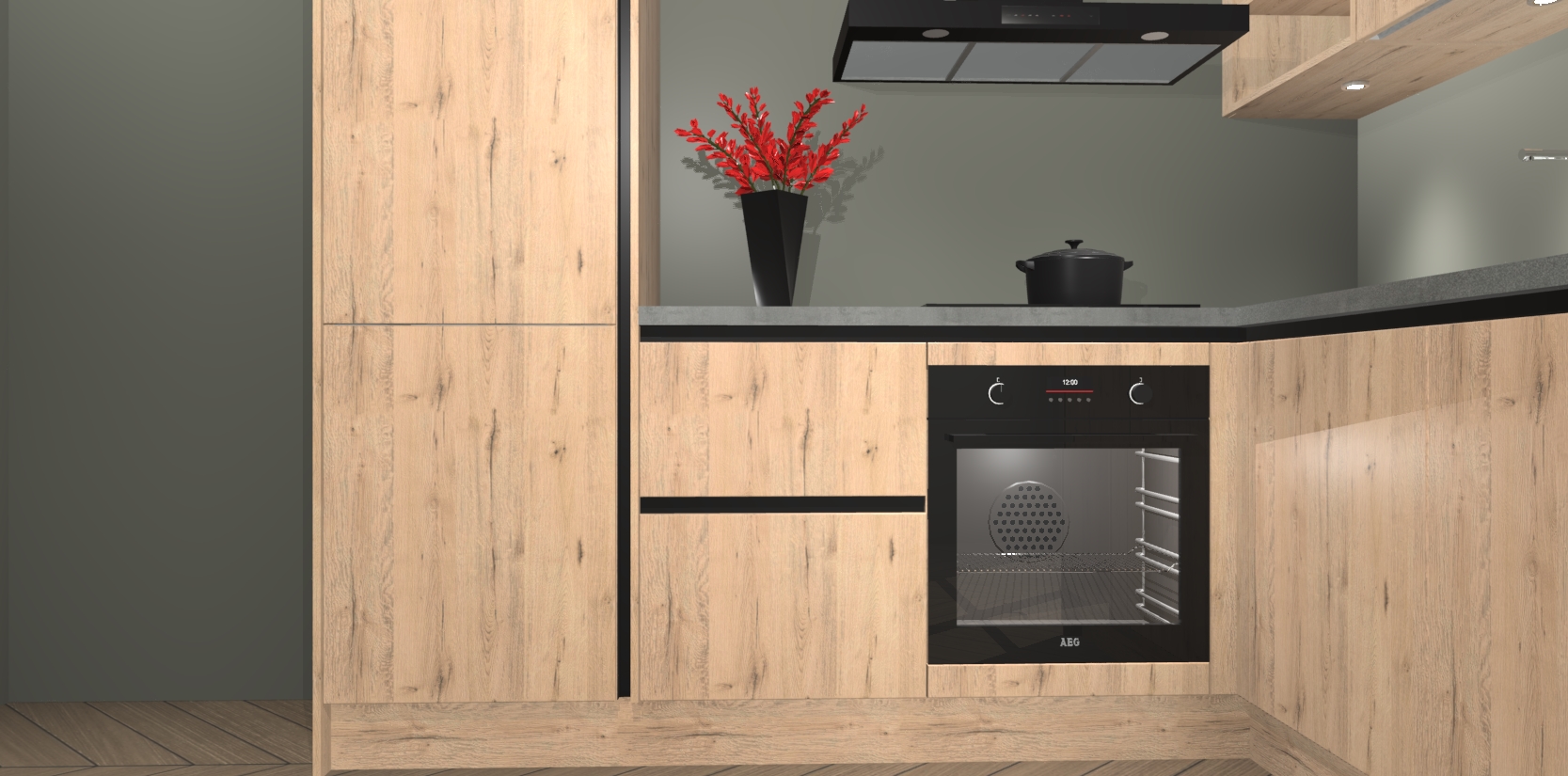 Wauw, dit is de Madera Natuur greeploze keuken Pilsen! U kunt gerust zeggen dat u elegantie combineert met functionaliteit met deze keuken. Met een modern en chique ontwerp is de keuken precies wat u nodig heeft om uw ruimte te verfraaien. De binnenzijde van de kasten is in dezelfde donkere kleur als de buitenzijde voor een uniforme look, compleet met softclose-kasten die stil sluiten.