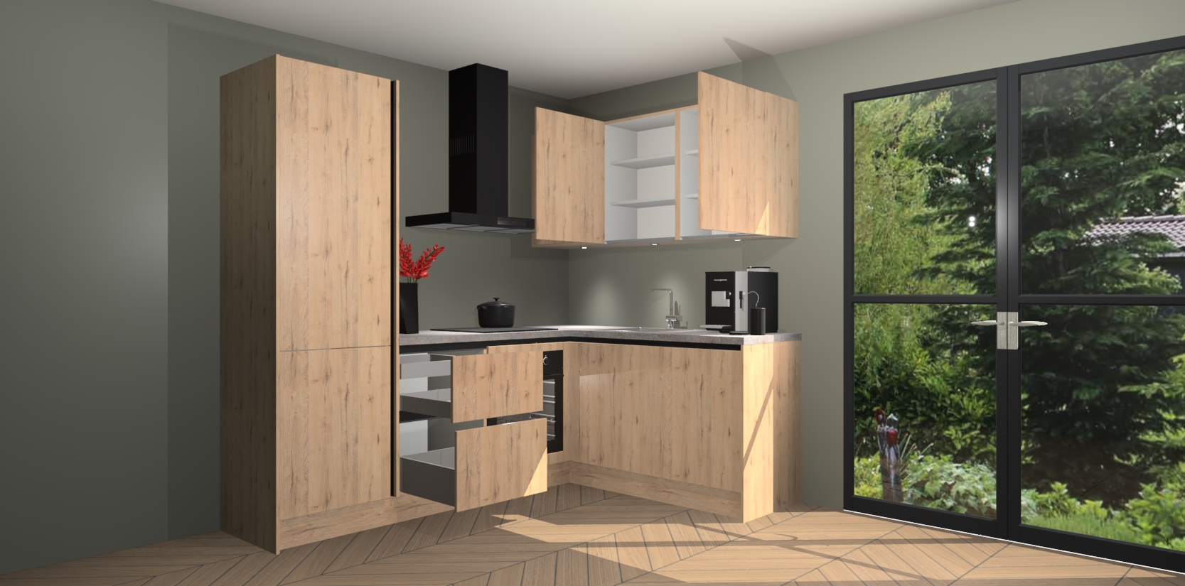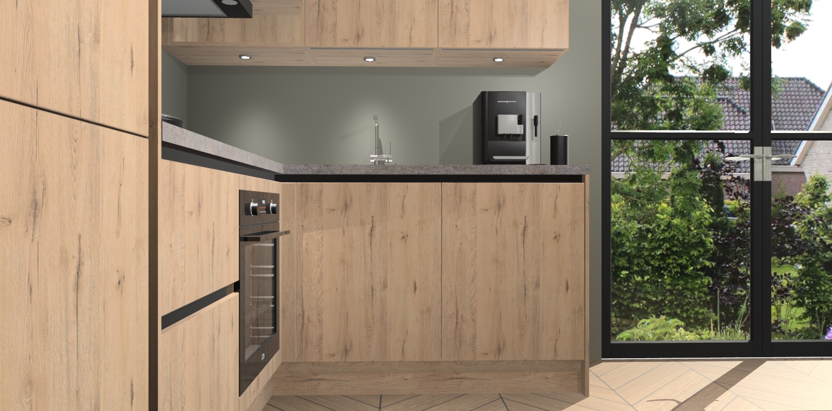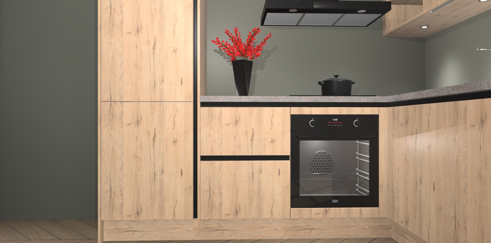 Wauw, dit is de Madera Natuur greeploze keuken Pilsen! U kunt gerust zeggen dat u elegantie combineert met functionaliteit met deze keuken. Met een modern en chique ontwerp is de keuken precies wat u nodig heeft om uw ruimte te verfraaien. De binnenzijde van de kasten is in dezelfde donkere kleur als de buitenzijde voor een uniforme look, compleet met softclose-kasten die stil sluiten.