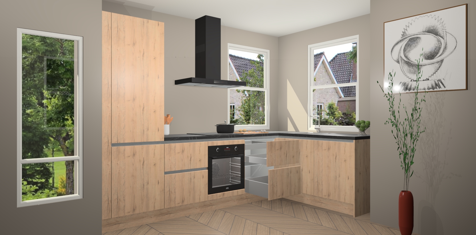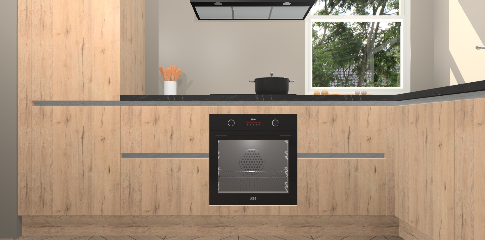 Wat maakt deze keuken zo bijzonder? Ten eerste geeft het houten werkblad uw ruimte een onmiskenbaar klassieke uitstraling. De natuurlijke afwerking roept warmte en elegantie op die nooit uit de mode zullen raken. Bovendien is het gemakkelijk schoon te houden en te onderhouden, zodat je er jarenlang plezier van kunt hebben. Als u op zoek bent naar extra gemak in uw keuken, dan heeft u bij het plaatsen van een bestelling bij ons ook de optie om uw toestellen te upgraden naar AEG-modellen - zo haalt u moderne innovatie van topmerken in apparatentechnologie rechtstreeks in huis.
