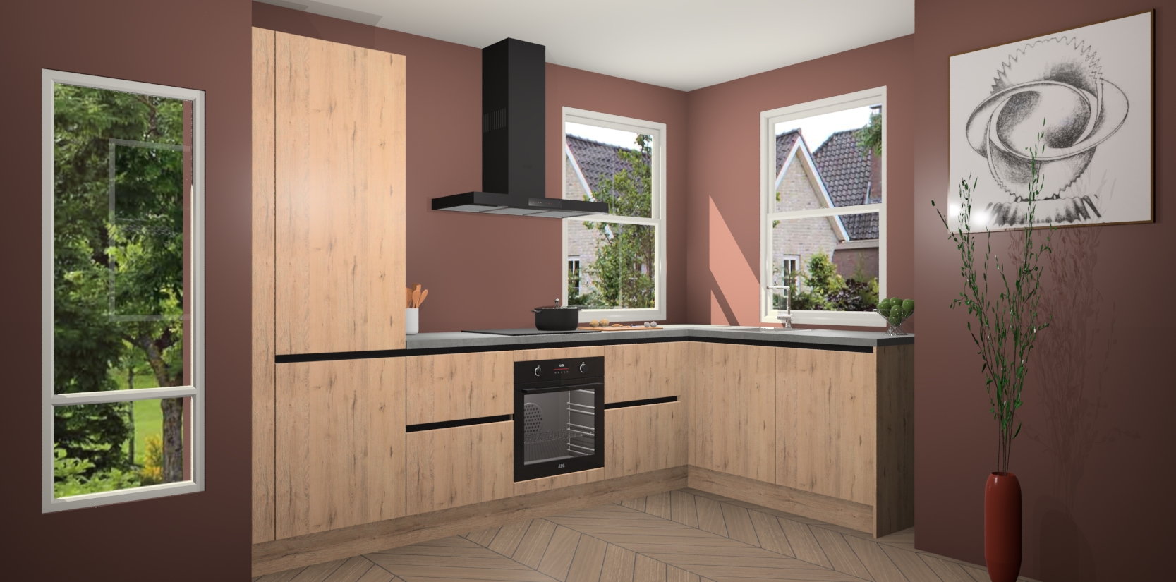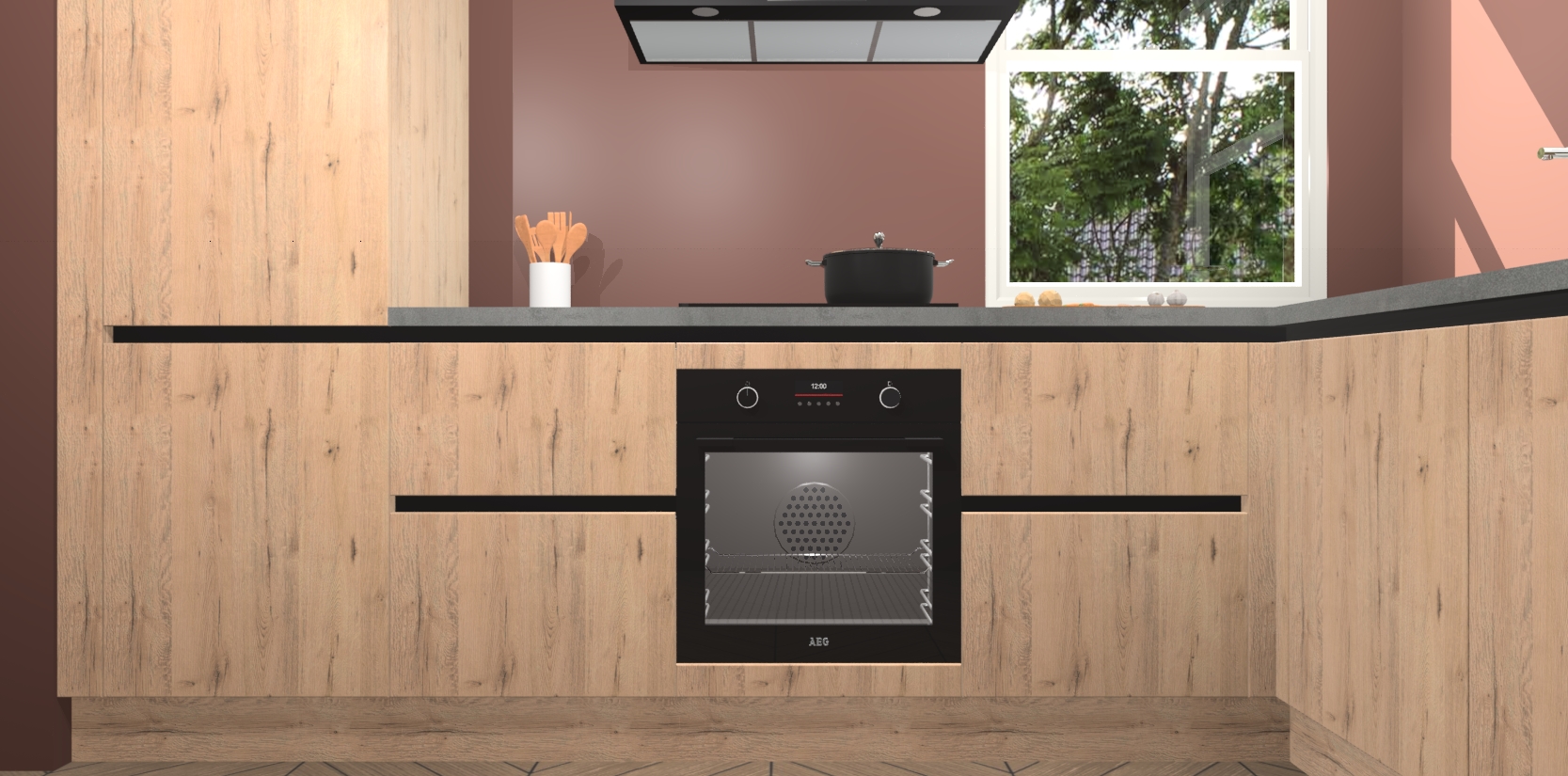 Wat maakt deze keuken zo bijzonder? Ten eerste geeft het houten werkblad uw ruimte een onmiskenbaar klassieke uitstraling. De natuurlijke afwerking roept warmte en elegantie op die nooit uit de mode zullen raken. Bovendien is het gemakkelijk schoon te houden en te onderhouden, zodat je er jarenlang plezier van kunt hebben. Als u op zoek bent naar extra gemak in uw keuken, dan heeft u bij het plaatsen van een bestelling bij ons ook de optie om uw toestellen te upgraden naar AEG-modellen - zo haalt u moderne innovatie van topmerken in apparatentechnologie rechtstreeks in huis.