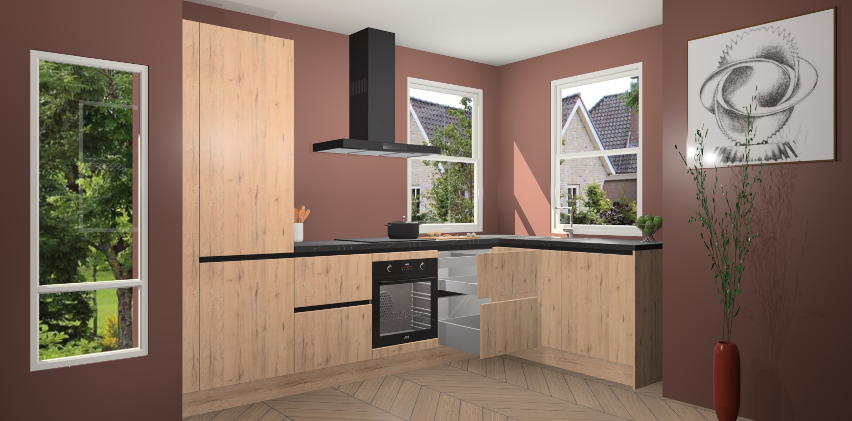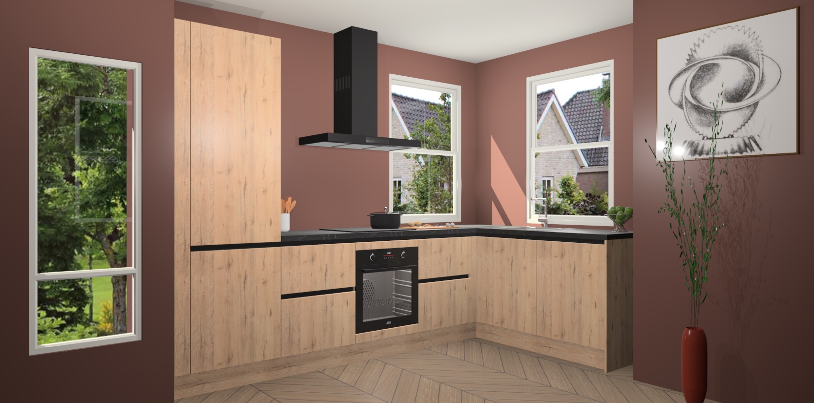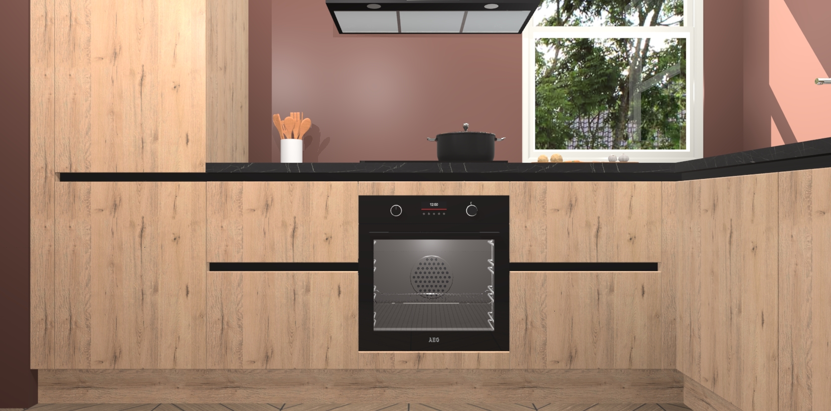 Wat maakt deze keuken zo bijzonder? Ten eerste geeft het houten werkblad uw ruimte een onmiskenbaar klassieke uitstraling. De natuurlijke afwerking roept warmte en elegantie op die nooit uit de mode zullen raken. Bovendien is het gemakkelijk schoon te houden en te onderhouden, zodat je er jarenlang plezier van kunt hebben. Als u op zoek bent naar extra gemak in uw keuken, dan heeft u bij het plaatsen van een bestelling bij ons ook de optie om uw toestellen te upgraden naar AEG-modellen - zo haalt u moderne innovatie van topmerken in apparatentechnologie rechtstreeks in huis.