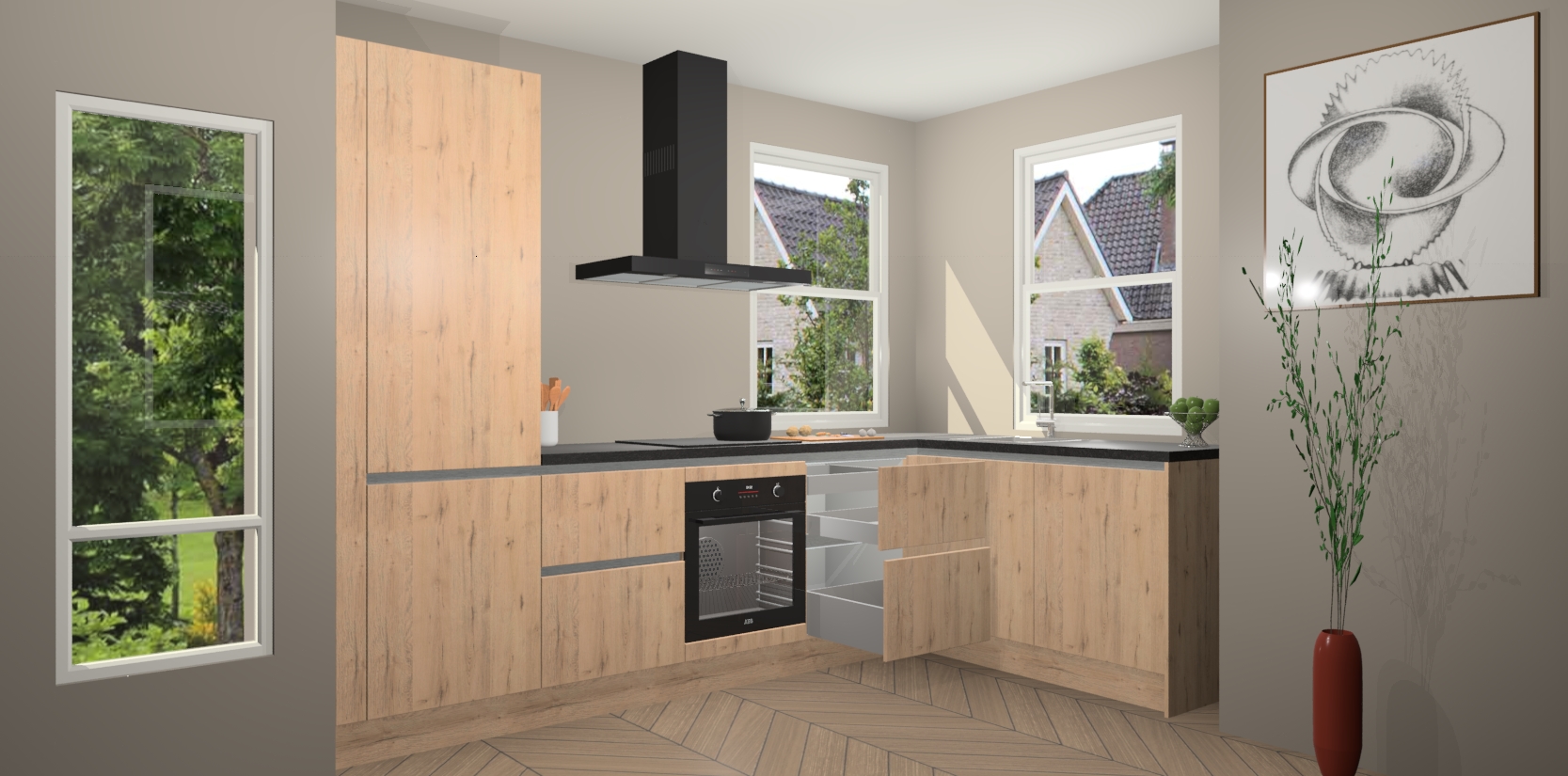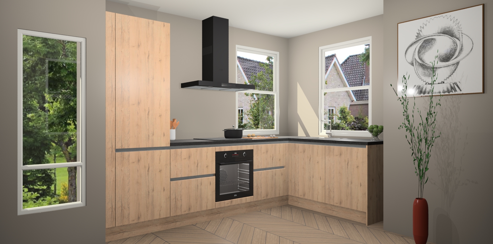 Wat maakt deze keuken zo bijzonder? Ten eerste geeft het houten werkblad uw ruimte een onmiskenbaar klassieke uitstraling. De natuurlijke afwerking roept warmte en elegantie op die nooit uit de mode zullen raken. Bovendien is het gemakkelijk schoon te houden en te onderhouden, zodat je er jarenlang plezier van kunt hebben. Als u op zoek bent naar extra gemak in uw keuken, dan heeft u bij het plaatsen van een bestelling bij ons ook de optie om uw toestellen te upgraden naar AEG-modellen - zo haalt u moderne innovatie van topmerken in apparatentechnologie rechtstreeks in huis.