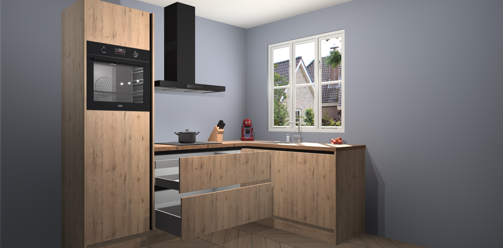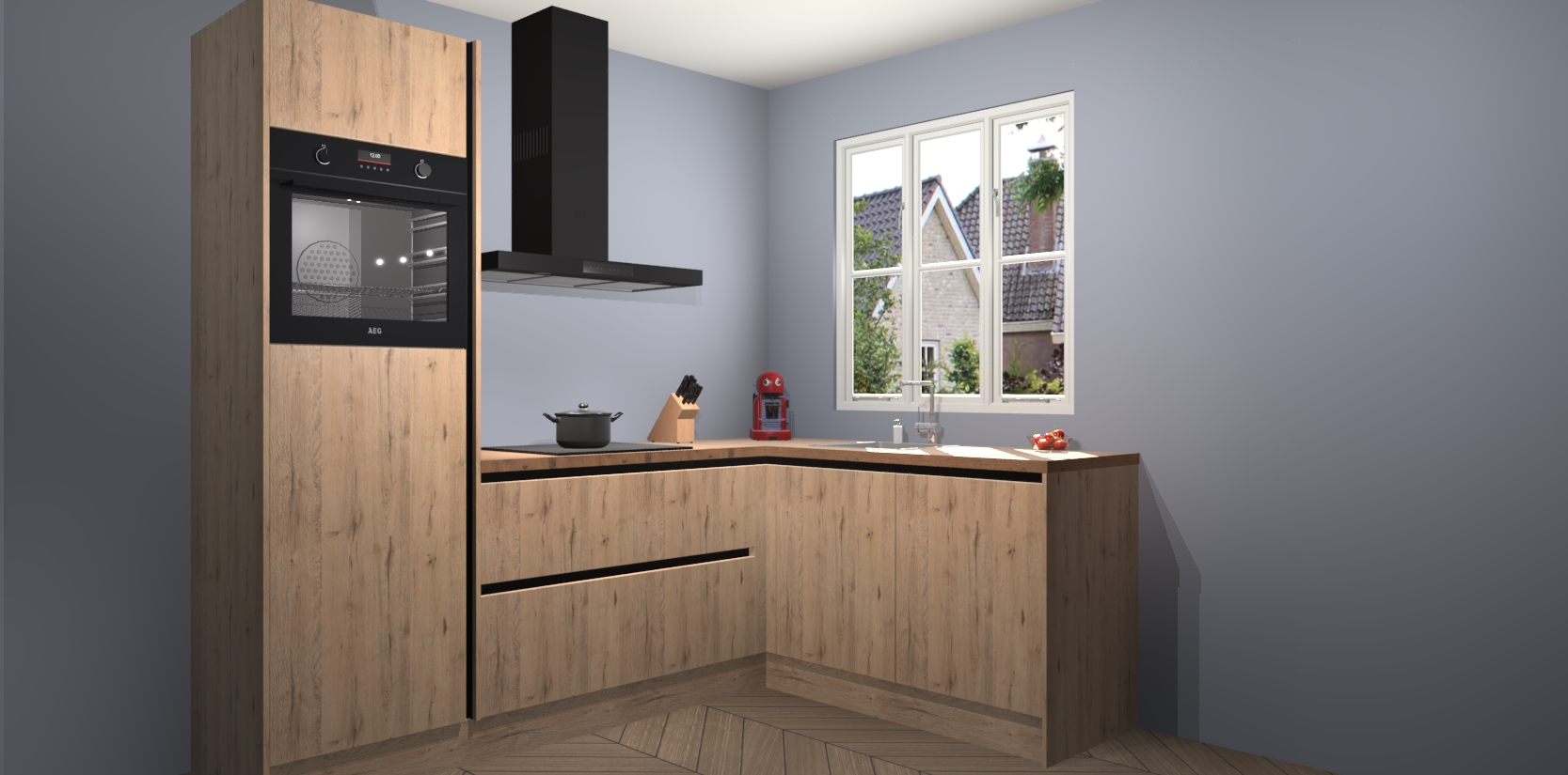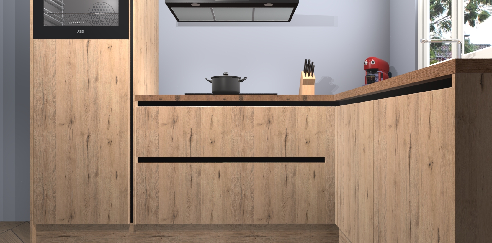 Dit model biedt u voldoende opbergruimte en vijf ingebouwde apparaten: een oven, inductiekookplaat, afzuigkap, vaatwasser en koelkast. Deze apparaten kunnen gemakkelijk worden geüpgrade naar AEG nadat u besteld heeft. De verschillende laden en kastjes bevatten softclose-deuren waardoor ze gezellig dichtvallen met een geruststellend helemaal geruisloos geluid. En dat is nog niet alles! We garanderen ook dat de prijs altijd laag blijft - dus haal nu uw Madera Natuur greeploze keuken Victoria terwijl het kan.