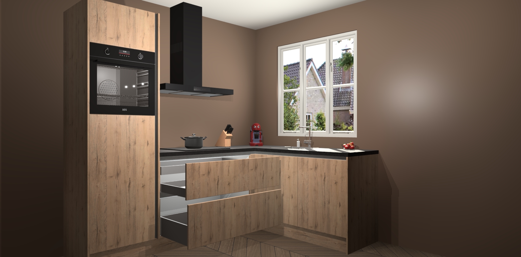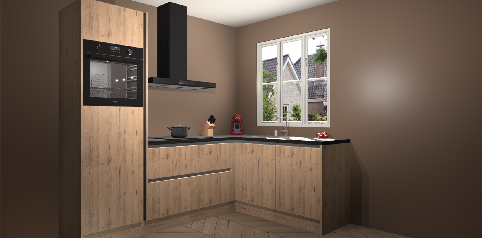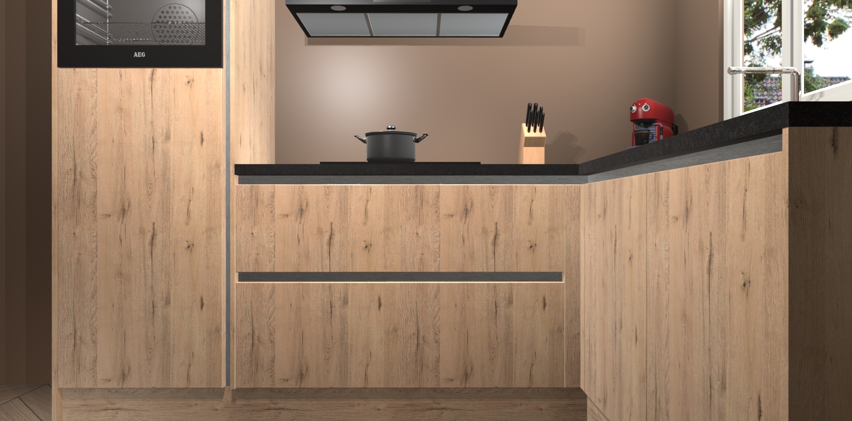 Dit model biedt u voldoende opbergruimte en vijf ingebouwde apparaten: een oven, inductiekookplaat, afzuigkap, vaatwasser en koelkast. Deze apparaten kunnen gemakkelijk worden geüpgrade naar AEG nadat u besteld heeft. De verschillende laden en kastjes bevatten softclose-deuren waardoor ze gezellig dichtvallen met een geruststellend helemaal geruisloos geluid. En dat is nog niet alles! We garanderen ook dat de prijs altijd laag blijft - dus haal nu uw Madera Natuur greeploze keuken Victoria terwijl het kan.