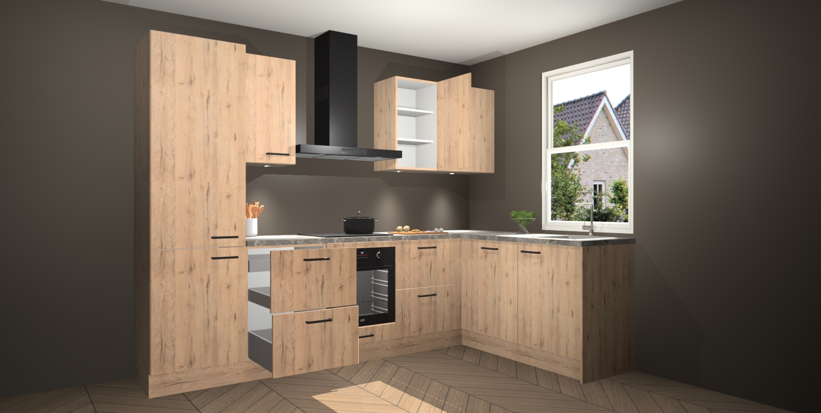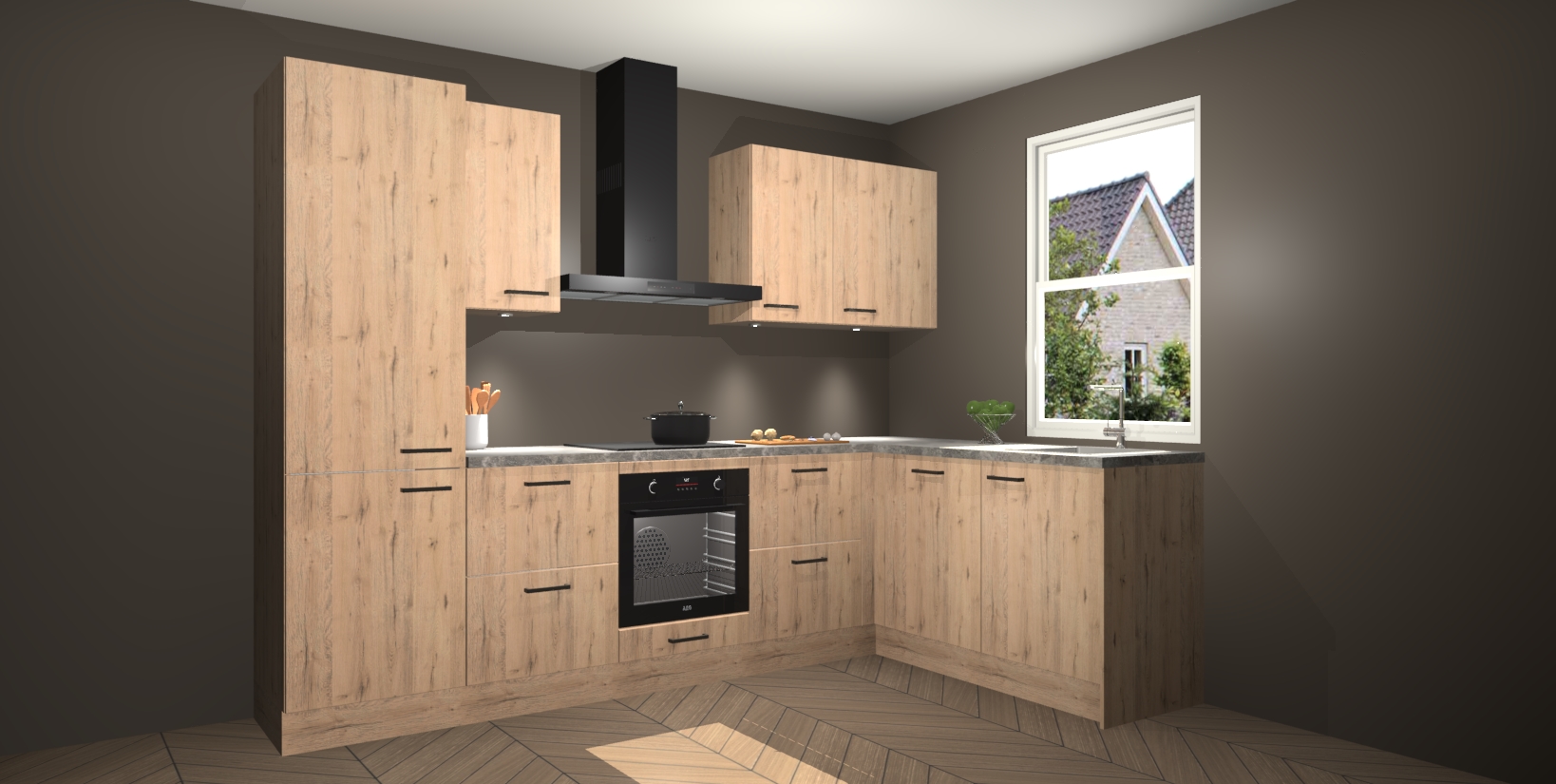 Maak kennis met de trendsettende en luxe Madera Natuur keuken Bazel! Deze uitzonderlijke keuken van Duitse kwaliteit is stijlvol, modern en perfect om elk huis mee op te fleuren. De binnenkant van de kasten worden meegenomen in een bijpassende kleur om een samenhangende eigentijdse esthetiek te voltooien. U zult dol zijn op hoe uw pas gerenoveerde keuken eruitziet met de Madera Natuur editie!