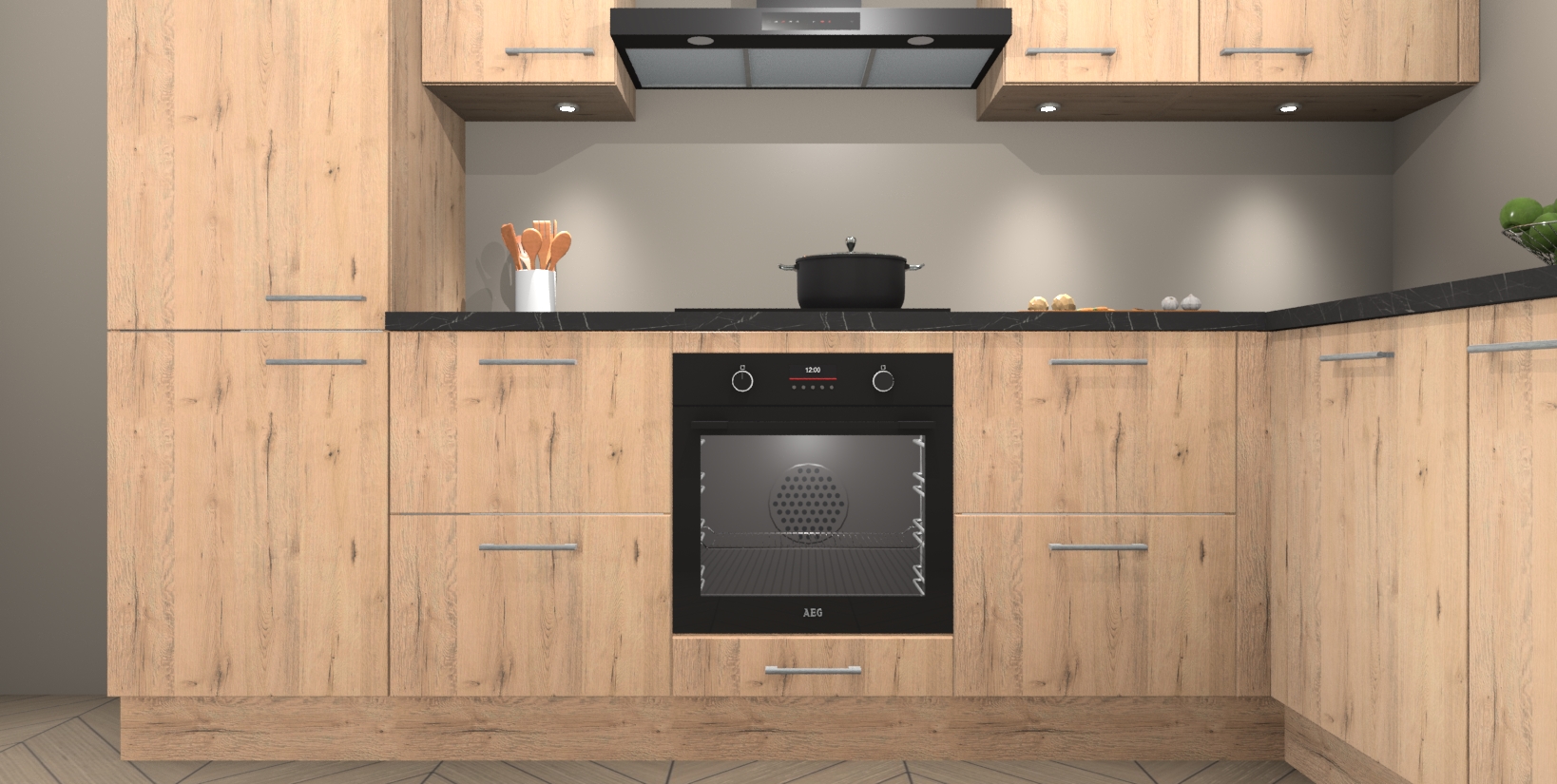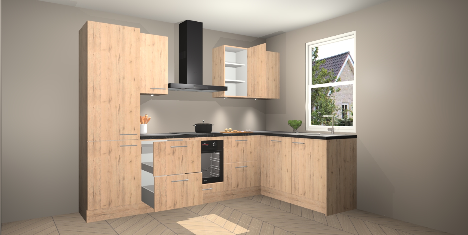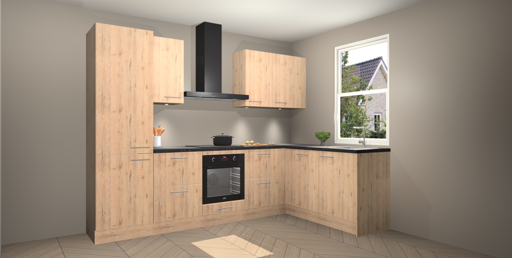 Maak kennis met de trendsettende en luxe Madera Natuur keuken Bazel! Deze uitzonderlijke keuken van Duitse kwaliteit is stijlvol, modern en perfect om elk huis mee op te fleuren. De binnenkant van de kasten worden meegenomen in een bijpassende kleur om een samenhangende eigentijdse esthetiek te voltooien. U zult dol zijn op hoe uw pas gerenoveerde keuken eruitziet met de Madera Natuur editie!